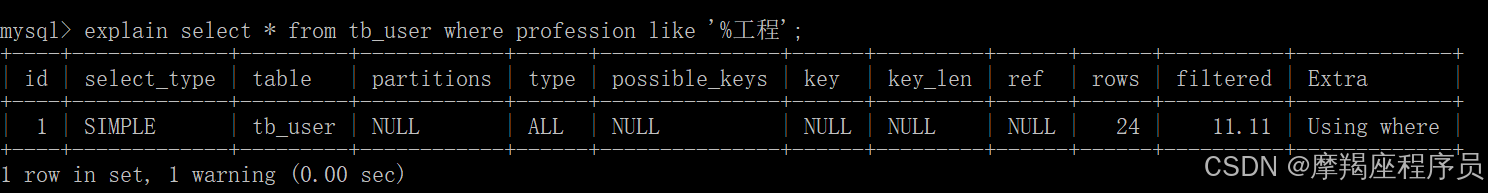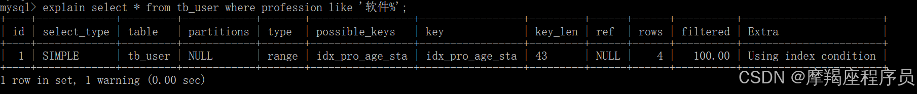 explain select * from tb_user where profession like '软件%'; explain select * from tb_user where profession like '%工程';