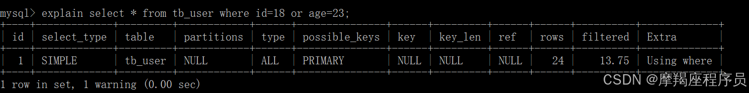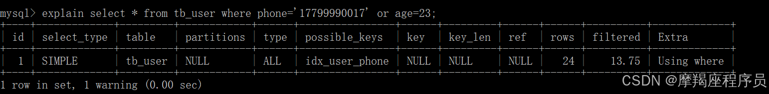 explain select * from tb_user where id=10 or age=23; explain select * from tb_user where phone='17799990017' or age=23;