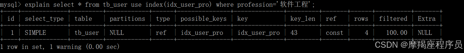 explain select * from tb_user use index(idx_user_pro) where profession='软件工程';