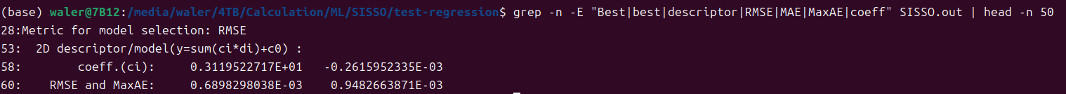 grep -n -E "Best|best|descriptor|RMSE|MAE|MaxAE|coeff" SISSO.out | head -n 50