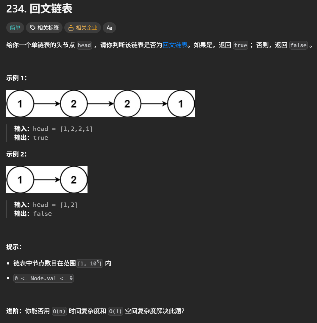 5.最后,同时遍历head和head2这两个链表,每次循环判断head.val是否等于head2.val,若不相等,则返回false。循环直到head2链表遍历结束,如果循环中没有返回false,则说明链表是回文的,返回true。