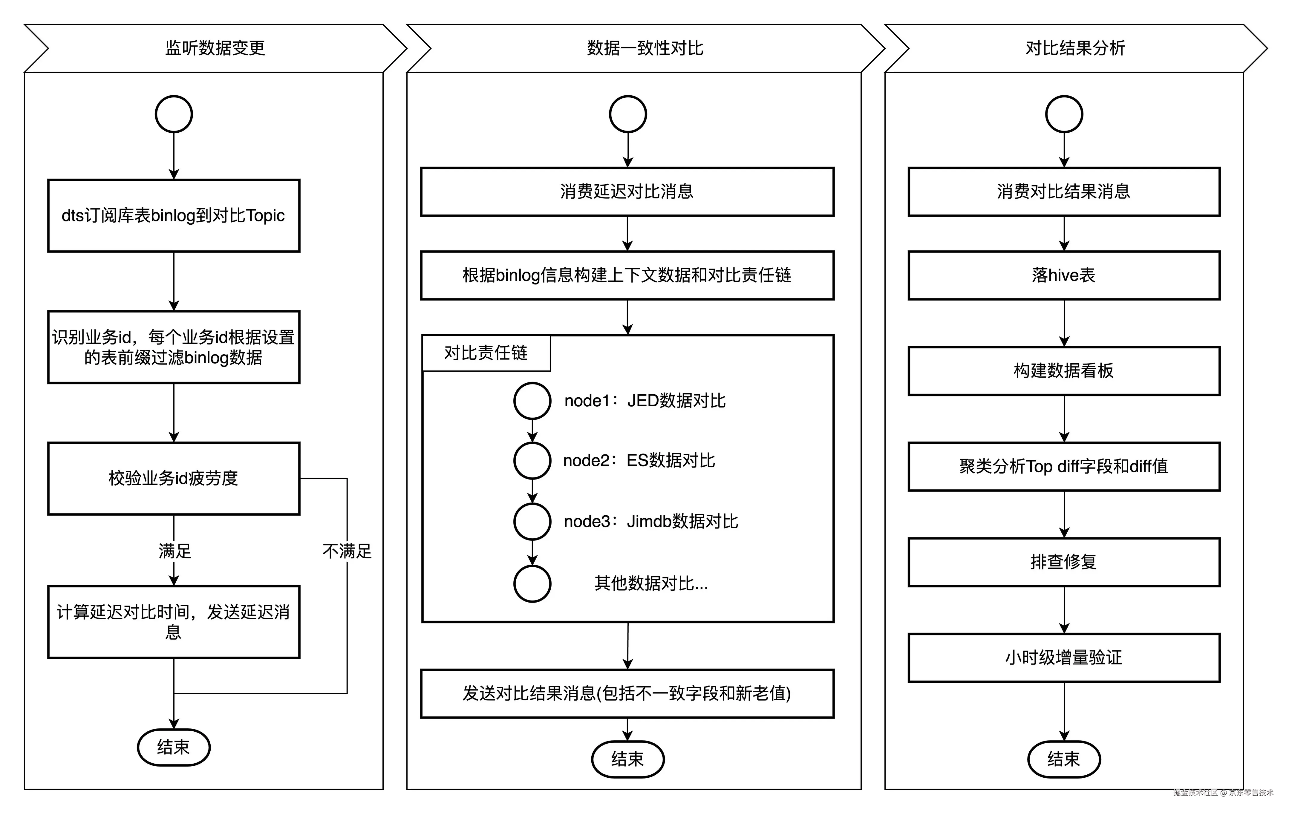 •订阅 Binlog 增量消息,每个表的 Binlog 触发一个检测修复的责任链,链上每个节点通过调用新老系统接口实现同构(如 MySQL 到 MySQL)和异构(如 MySQL 到 ES、Cache 等)数据源的实时一致性比对校验,每个节点可单独设置对比延迟时间。