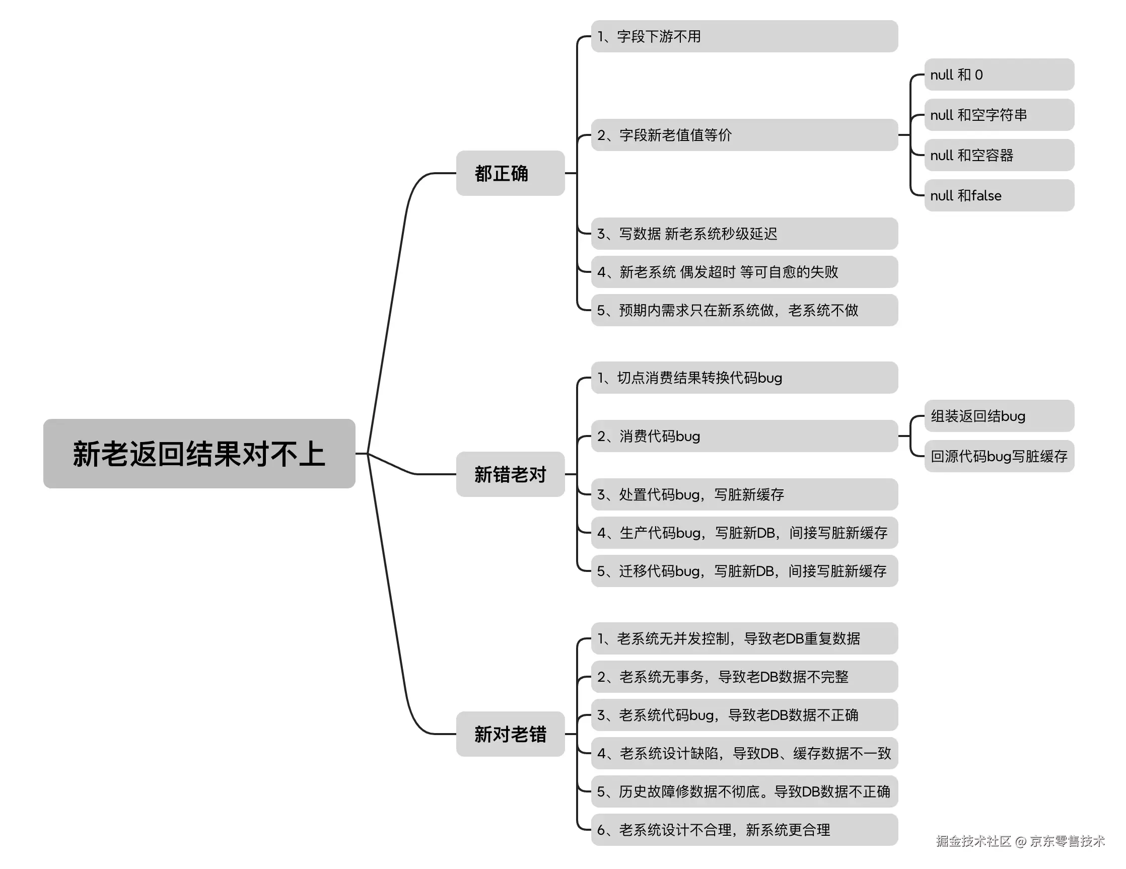 这也是很多重构项目都会面临的难题,如何保证重构后的代码逻辑与之前的逻辑是一致的,大家想到最多的就是利用流量回放和 diff 进行逻辑一致性的验证。但是,理想很丰满,现实很骨感,我们做了线上的流量 diff 后发现存在大量的不一致 case,这个比例非常高。