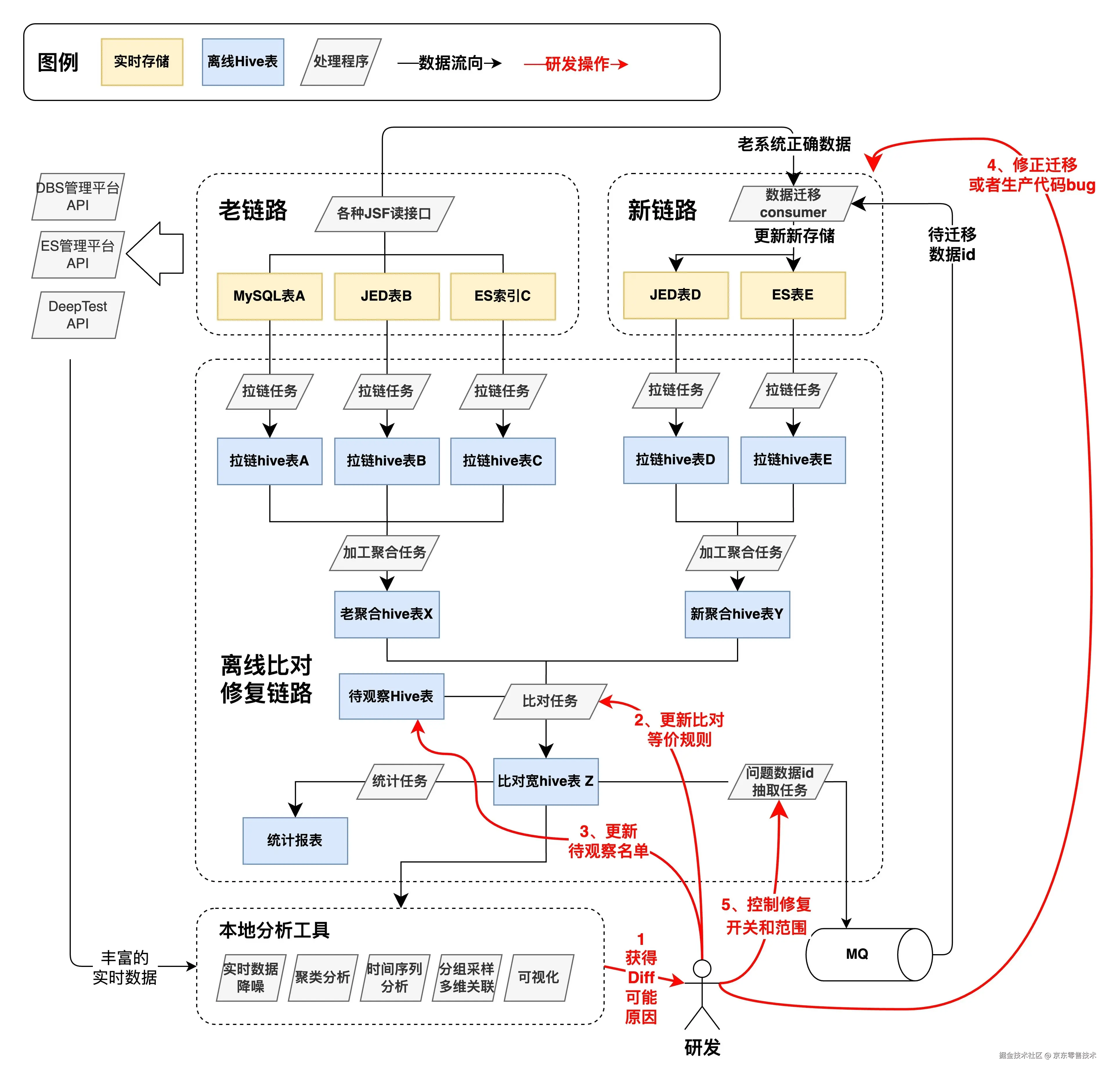 将 JED、ES 等系统的数据同步到离线数仓(Hive 表),借助 Spark 进行数据加工和聚合,生成对比数据。通过对比报表和本地分析工具,我们能够快速分析出 diff 的具体原因。如果属于迁移或生产代码 bug,则修正代码并对问题数据进行重迁移;如果不是问题,则优化比对规则,降低误报噪音。通过这一流程,diff 数量持续收敛,直到数据全部对齐为止。