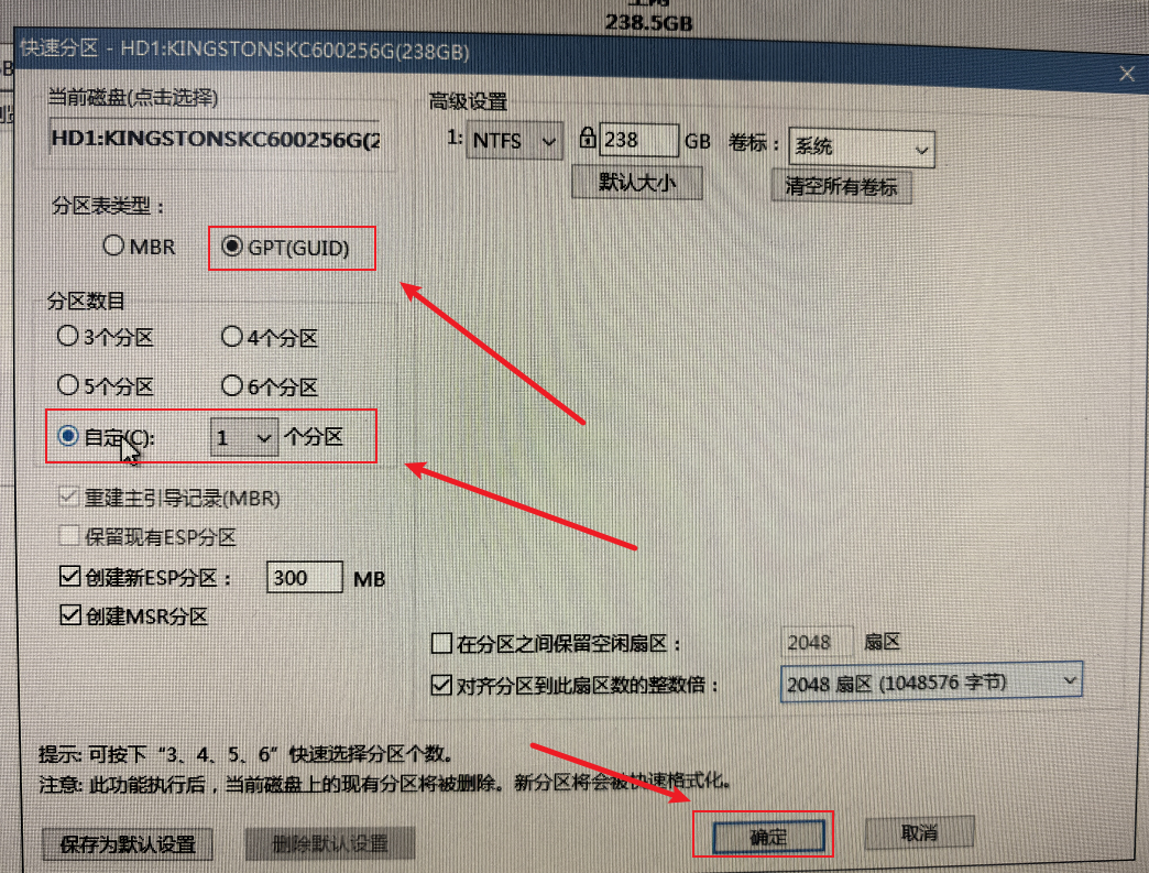 然后按照图下所示,分区表类型 选择GPT(GUID) ,分区数目选择自定1个分区 ,其他不用管了。点击确定即可