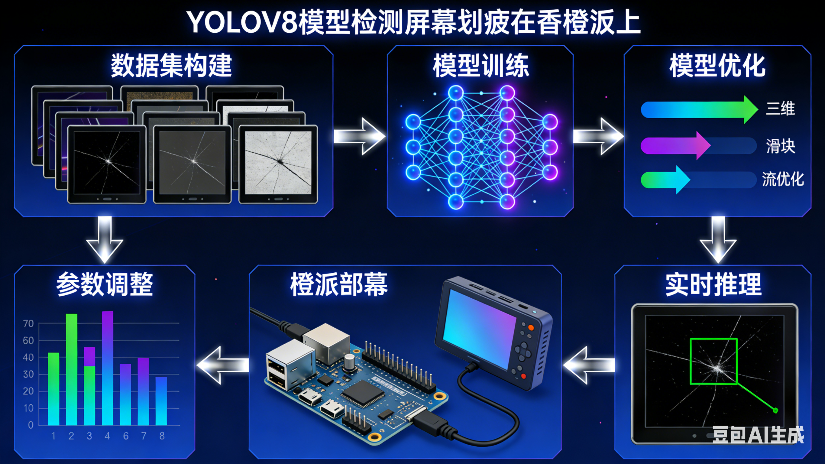 大家好!今天分享一套面向屏幕质检场景的轻量化解决方案------基于YOLOv8模型实现屏幕划痕的精准检测,并将训练好的模型部署到香橙派开发板完成边缘实时推理。该方案兼顾检测精度与部署效率,可广泛应用于手机屏幕、车载中控屏、工业显示屏等产品的自动化质检环节。下面从实操角度,一步步拆解实现过程。