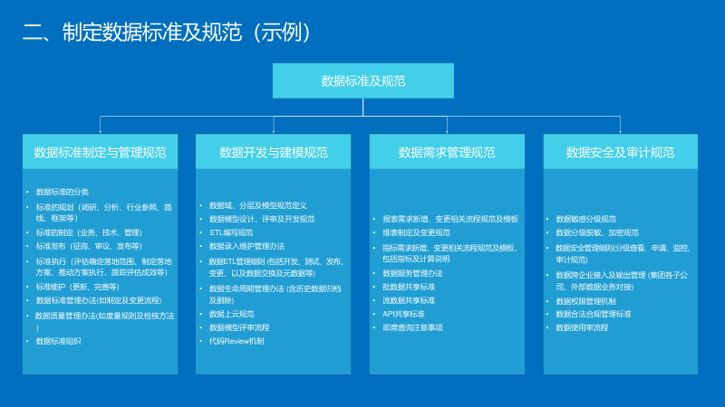 - 制定数据标准:分类制定基础类、指标类数据标准,规范数据定义、格式、质量要求等,为数据治理提供统一依据。