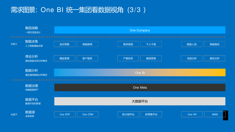 - 统一数据视角:通过One BI等工具,提供统一的集团数据视角,满足垂直业务及通用数据分析需求,辅助智能决策。