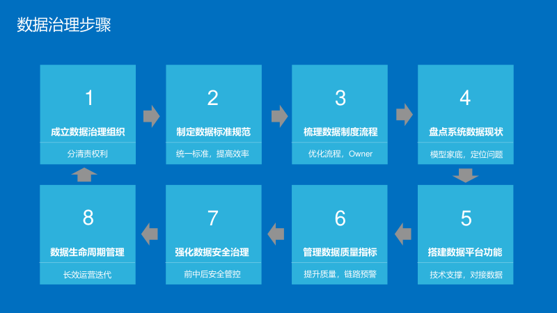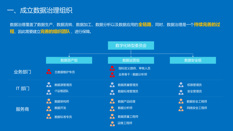 - 组织建设:成立数据治理组织,明确数据战略委员会、数据运营组、数据资产组及数据安全组的职责与分工,确保数据治理工作的有序开展。