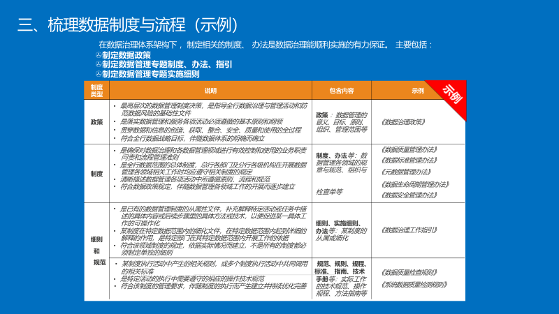 - 梳理数据制度与流程:制定数据政策、管理专题制度、实施细则等,明确数据治理的流程、规范与责任,确保数据治理工作的可操作性。