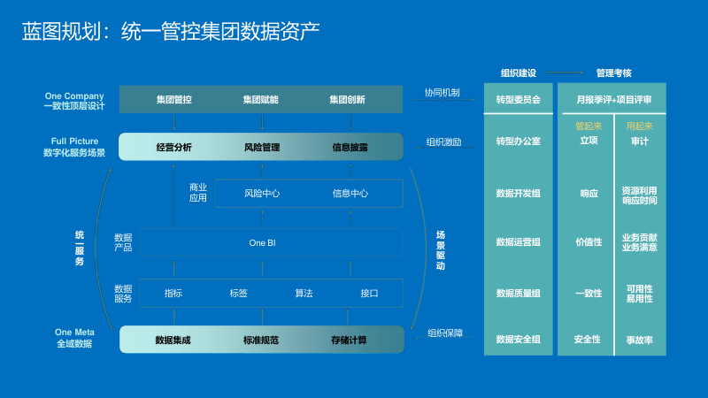 - 统一管控蓝图:规划集团数据资产的统一管控,涵盖数据集成、研发、生产运维、服务及治理等全链条。