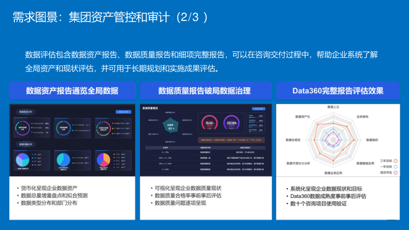 - 数据评估与报告:定期进行数据资产评估,生成数据资产报告、数据质量报告等,为企业提供全局资产和现状评估,支持长期规划与成果评估。