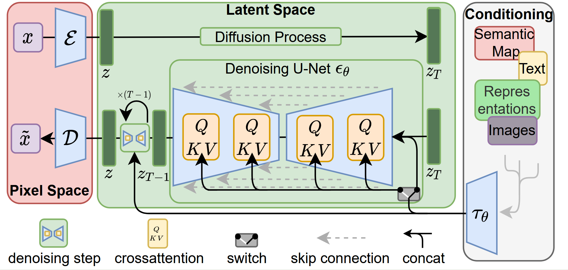 Stable Diffusion 基于 Latent Diffusion Model(LDM) 架构,将扩散过程从高维像素空间转移到由 VAE 学习得到的低维潜空间中。模型推理由文本编码器(CLIP)、潜空间去噪网络(条件 U-Net)和 VAE 解码器组成。VAE 负责在图像与潜变量之间进行双向映射。