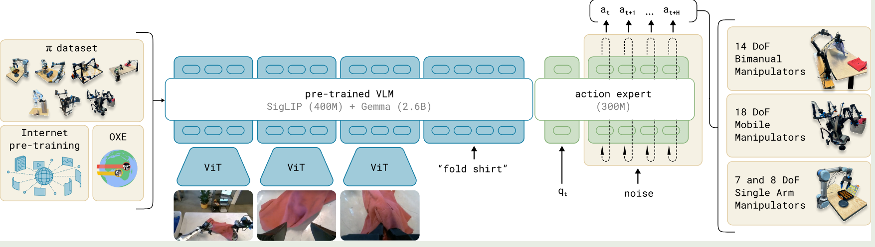 基于预训练VLM模型构建,充分利用训练好的VLM模型能力。使用多种类型的robot数据,包括单臂、双臂或者移动控制器等。