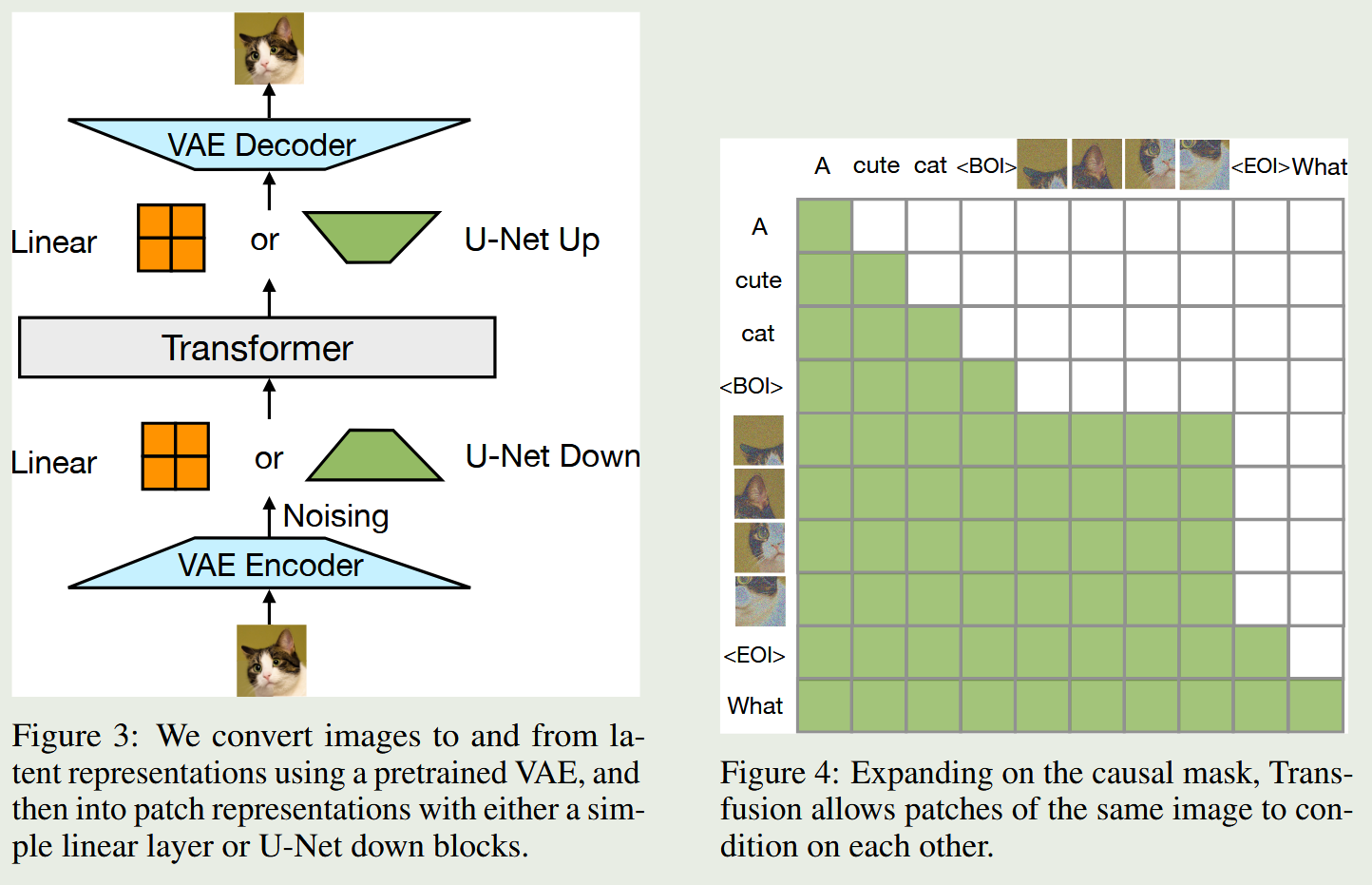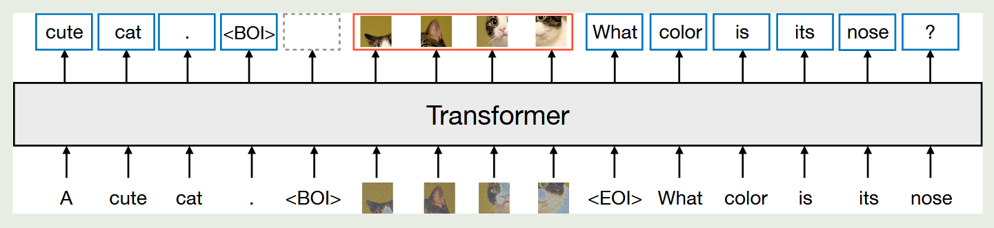 Transfusion基于Transformer进行训练。模型在文本上采用标准的 next-token prediction,在图像上采用扩散模型的噪声预测损失。模型采用了一种混合注意力机制:文本 token 之间使用因果注意力,而同一图像内部的 patch 之间使用双向注意力,主要是因为图像的patch之间有明显的双向依赖关系。