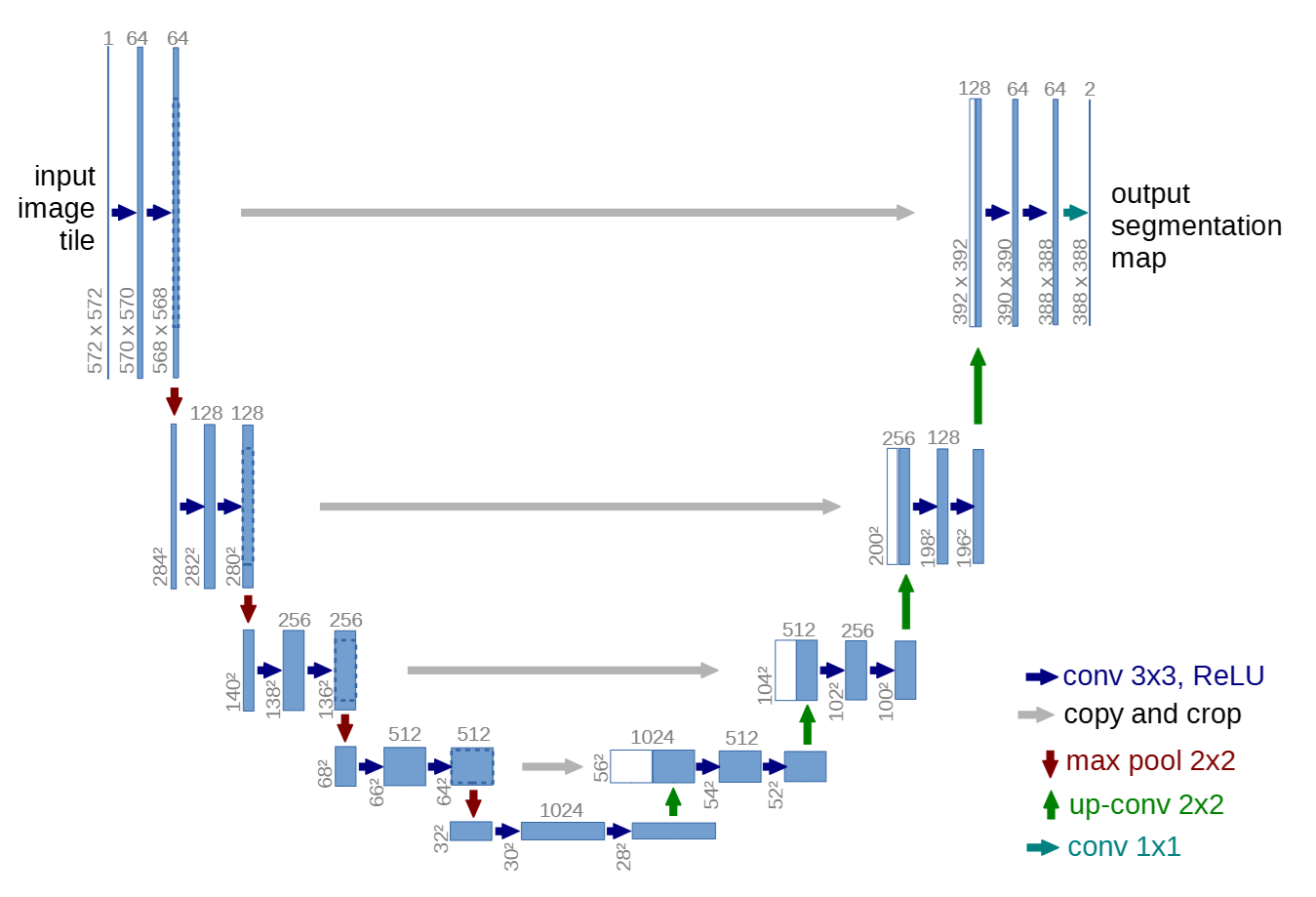 - 在原版 U-Net 中,由于使用的是 valid(不 padding)的 3×3 卷积,特征图在编码器阶段会不断变小,而解码器通过上采样无法恢复这些被卷积"吃掉"的边缘像素,因此同层的 encoder 与 decoder 特征图在空间尺寸上不一致