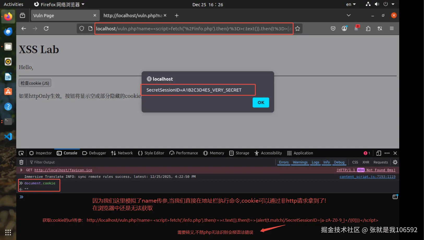 - 预期结果:页面执行注入的脚本,并弹出包含受保护 Cookie 的警告框。