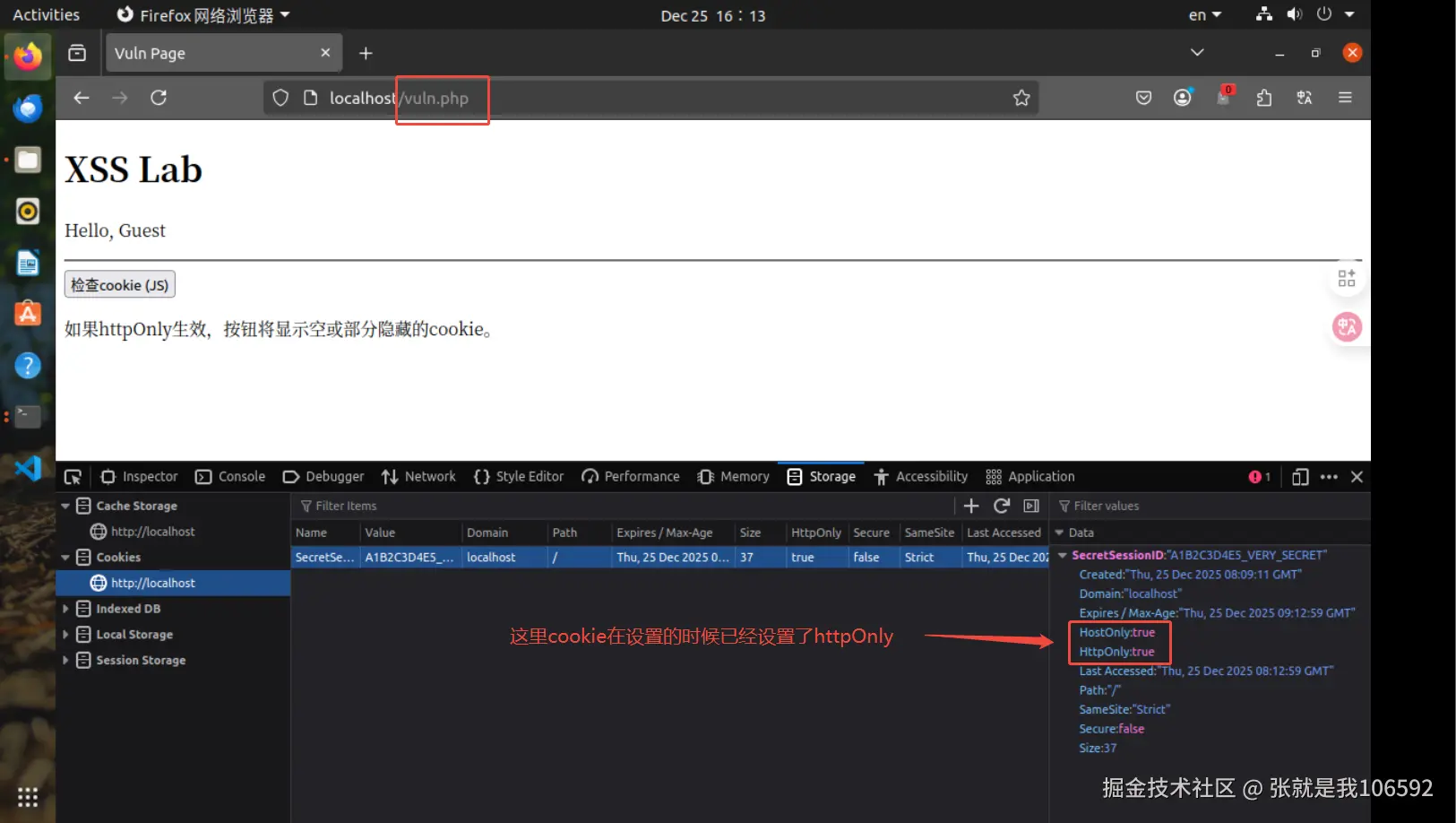 http://localhost/vuln.php。 - 打开开发者工具 (F12) -> Storage -> Cookies。