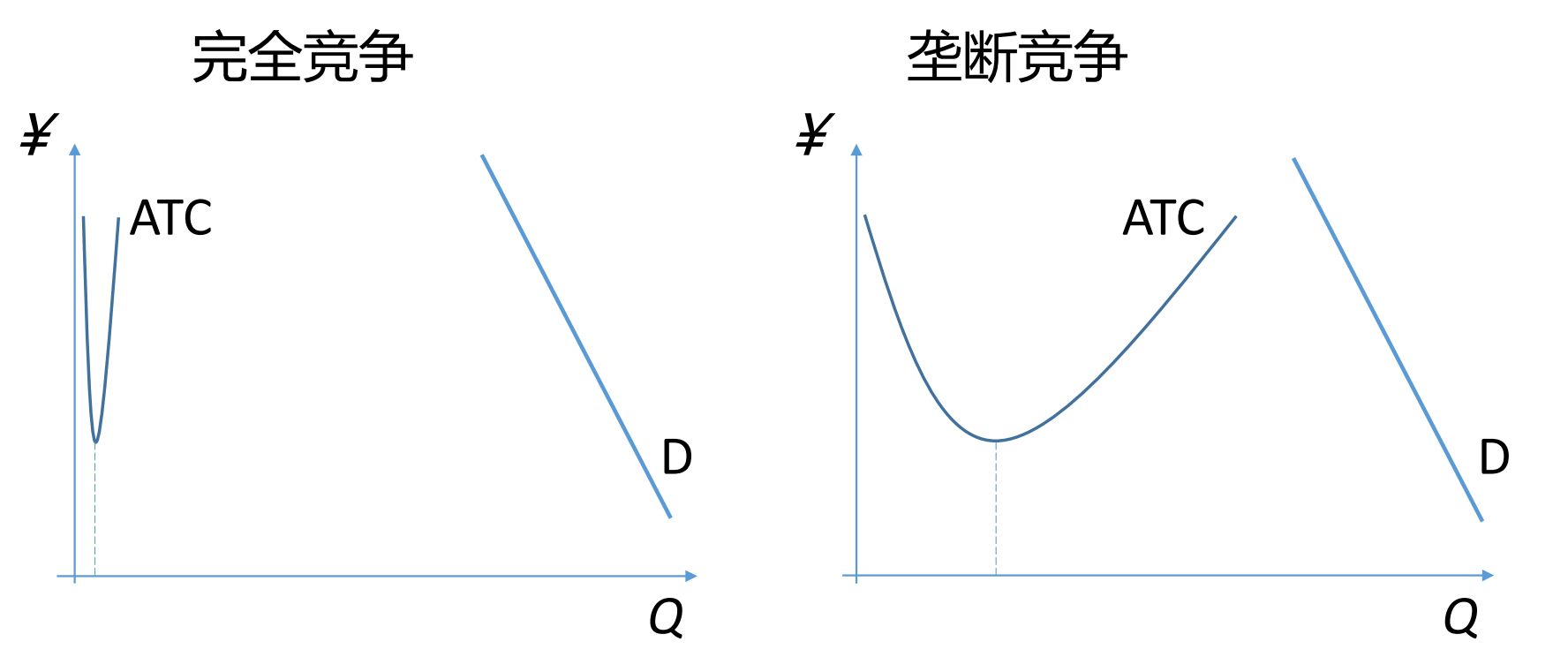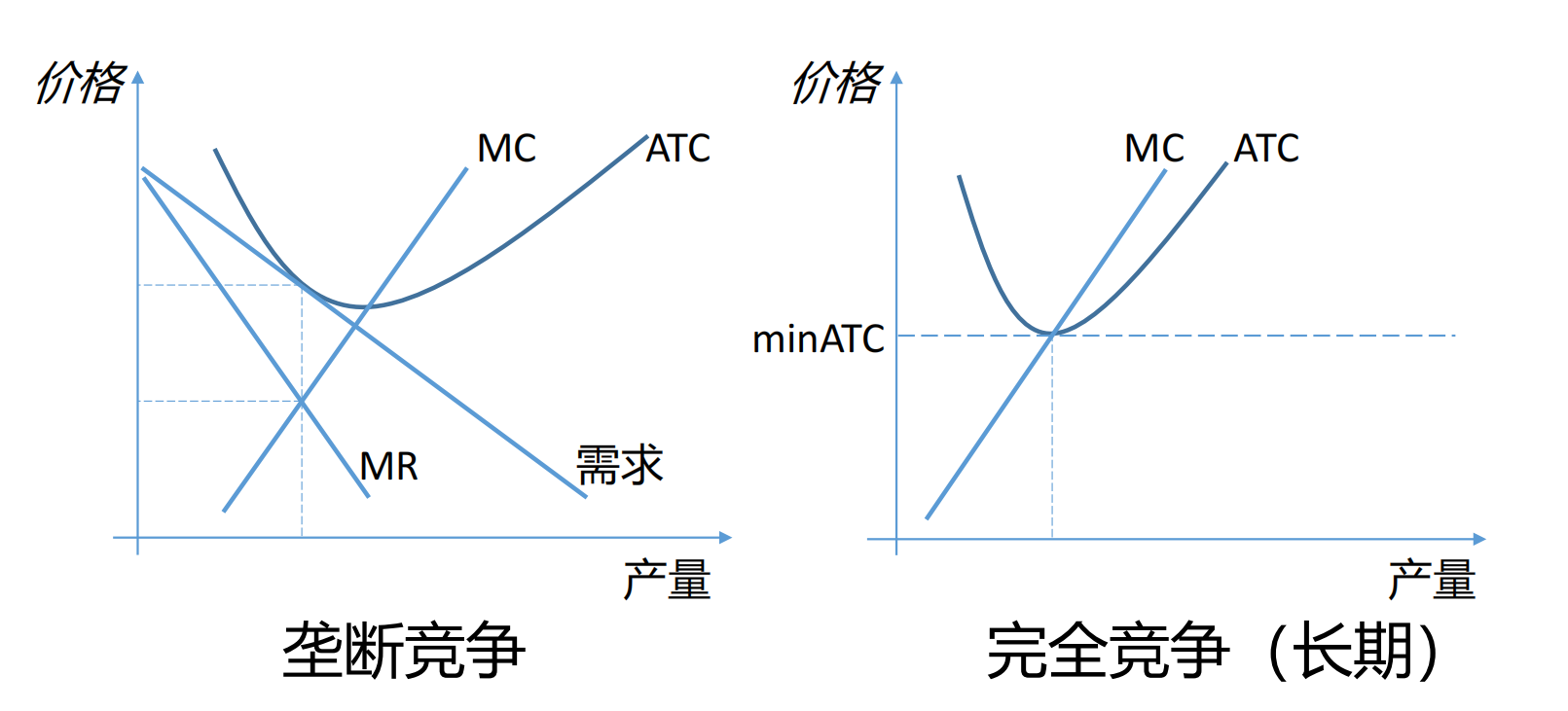 - 无论是左图的垄断竞争,还是右图的完全竞争,企业的价格(P)都正好等于其平均总成本(ATC)。
