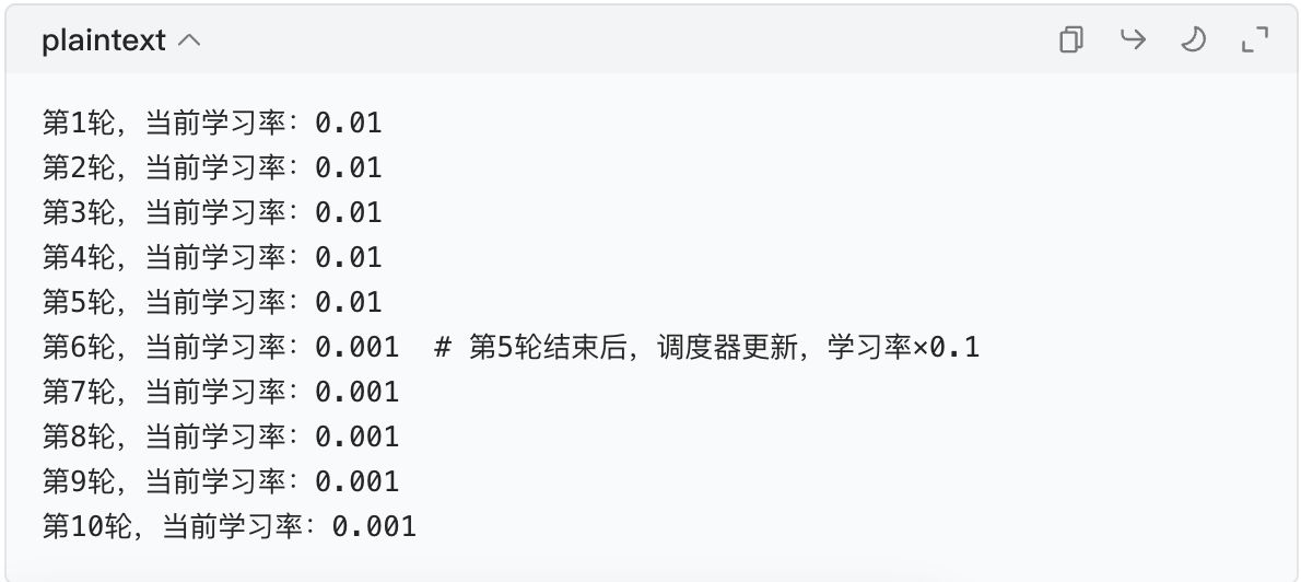 | StepLR | 修改step_size(比如从 5 改成 3)、gamma(比如从 0.1 改成 0.5),观察学习率下降速度; |
