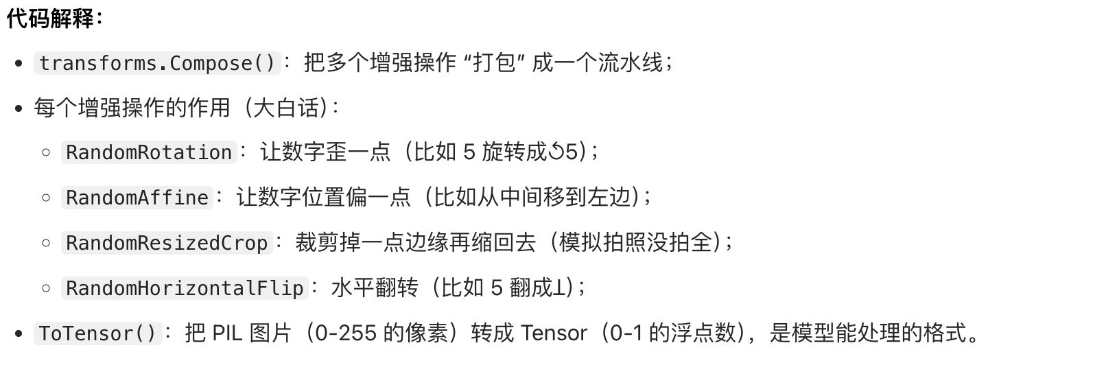 - 增强后:旋转 10 度的 5、稍微平移的 5、轻微缩放的 5(这些还是 5,但样子不同,相当于给模型多练题)