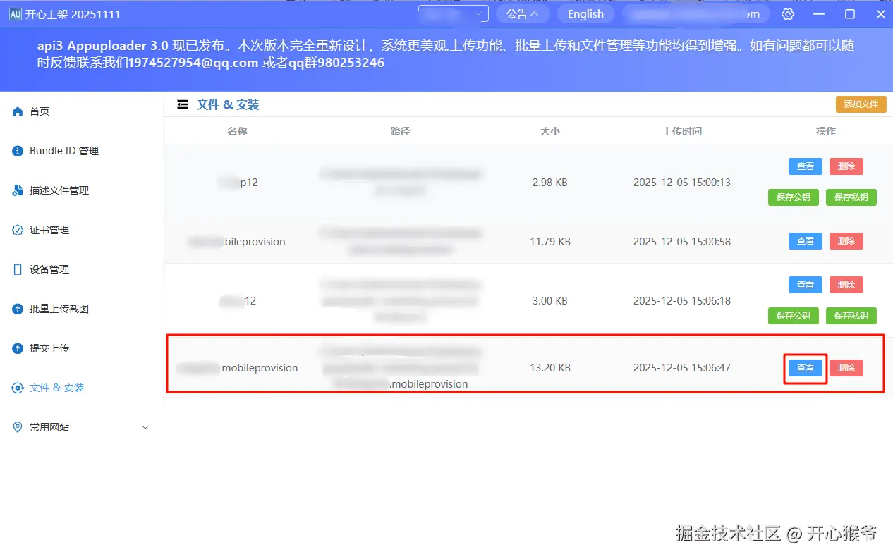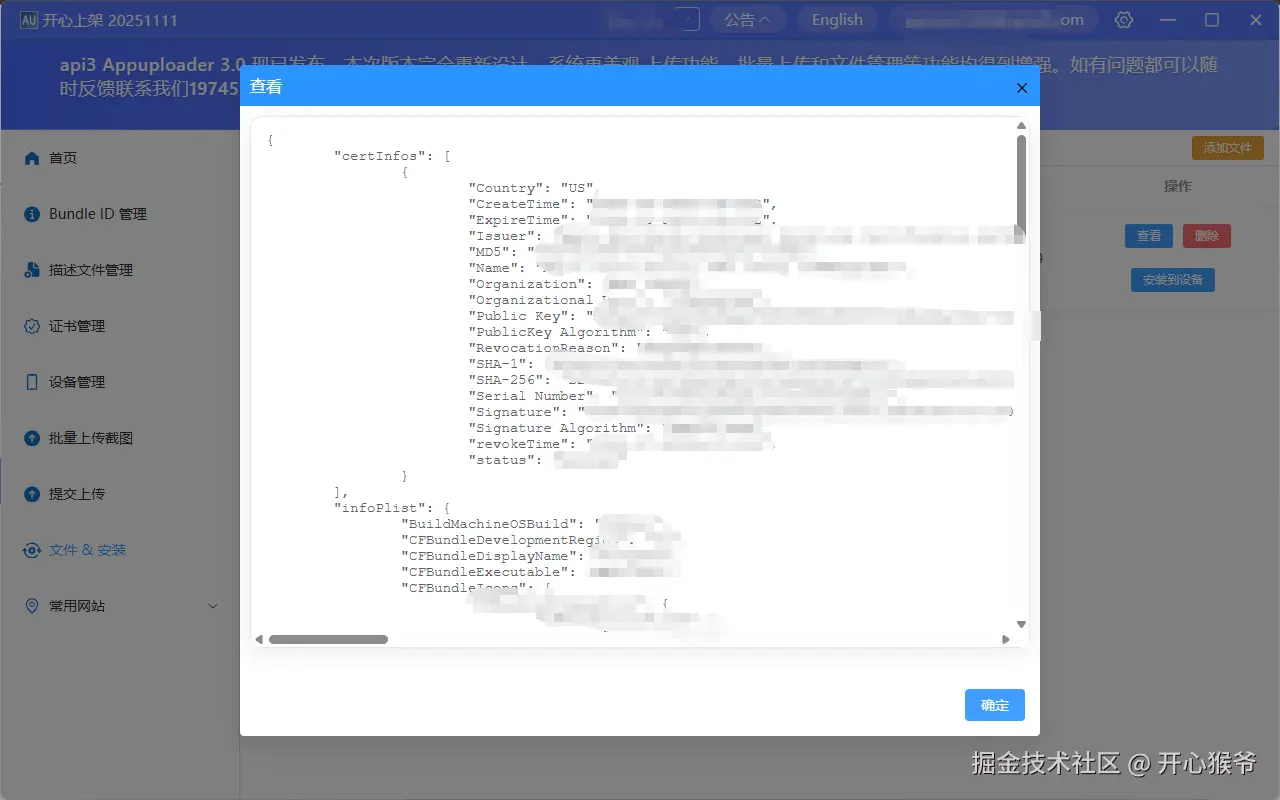 在提交前,通过 开心上架(Appuploader)查看 mobileprovision 文件内容 ,确认描述文件的真实属性,往往能提前发现一些"隐性不合规"。