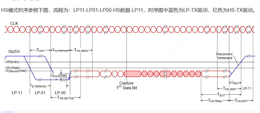 连续模式时钟全部工作在 HS 模式,非连续模式就是上图中情况,会在不发数据的时候,clk 进入 LP 模式。