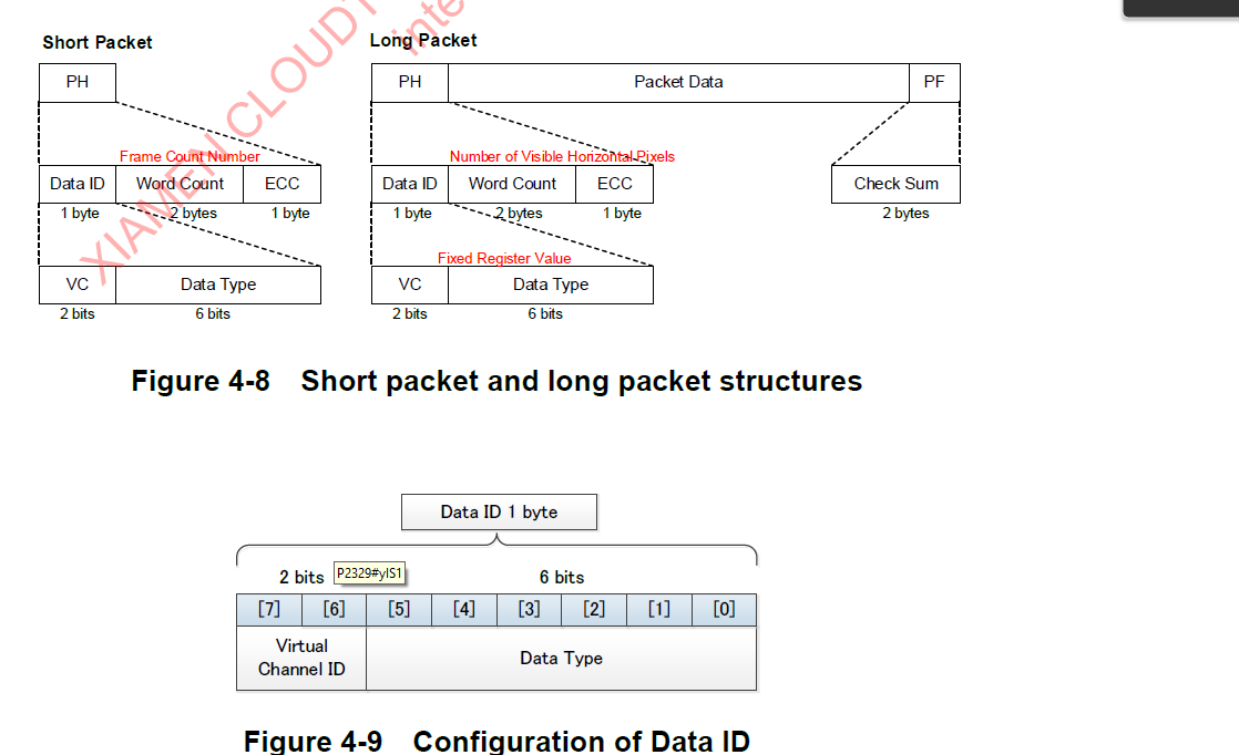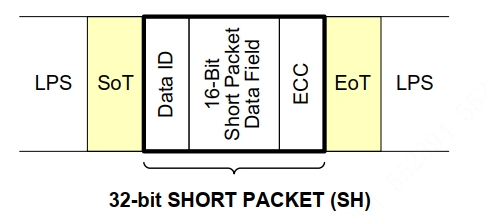具体包括:DI 8bit(2bit虚拟通道+6bit数据类型);WC 16bit,指示后续数据byte数;ECC 8bit(实际6bit,高2bit补0)为DI+WC 24bit的校验值。 - SP:short packet,短包32bit,结构和PH基本一样,区别在短包不接数据,所以中间16bit不是byte数而是附带信息, 通常为帧号。
