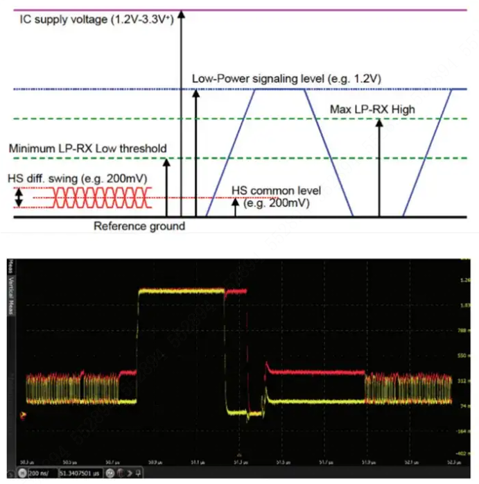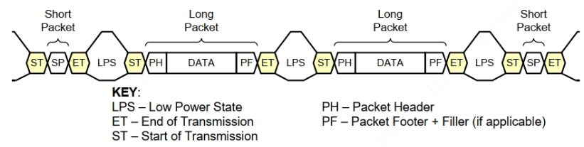 通道支持高速(HS)和低功耗(LP)两种工作模式。HS模式以低压差分信号传输高数据速率,而LP模式则以单端信号实现低功耗。HS 模式下采用低压差分信号,功耗较大,但是可以传输很高的数据速率(数据速率为 80M~4.5Gbps),支持 100mV 到 300mV 的电压范围;LP 模式下采用单端信号,数据速率很低(<10Mbps),但是相应的功耗也很低,支持0V到1.2V信号电平。