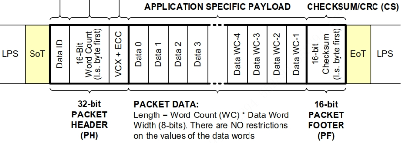 7:0\]=0,指示虚拟通道0,数据类型为FS,帧开始。 \[23:8\]=1,指示帧号为1。 \[31:24\]=0x1a,为ECC校验值。 * 长包 长包的完整流程和短包相似,主要区别在HS部分,第1个红框为SoT序列先不看,后面可以看到lane0、1传输3Byte,lane2、3传输2Byte,共计10Byte,构成是包头4Byte+数据4byte+校验2Byte。  包头4Byte,第2红框列,0x2a对应数据类型RAW8,0x00 以及0x04 组合的16bit wc 值 0x0004 对应数据长度4Byte,0x33对应ECC。 数据4Byte,第3红框列,对应数据4Byte分别为0x1、0x2、0x3、0x4。 校验2Byte,第4红框列,组合起来是0xc66e,为0x04030201的CRC值。 ps: LSB 先行,采集的时间上是从左往右(bit0 --\> bit7)。 参考: 1. [MIPI CSI-2 (2)HS模式 传输详解和波形图](https://devpress.csdn.net/xian/68a1ecf3a6db534ba2c3a8de.html?spm=1001.2101.3001.6661.1&utm_medium=distribute.pc_relevant_t0.none-task-blog-2~default~OPENSEARCH~activity-1-149056297-blog-154693163.235%5Ev43%5Epc_blog_bottom_relevance_base8&depth_1-utm_source=distribute.pc_relevant_t0.none-task-blog-2~default~OPENSEARCH~activity-1-149056297-blog-154693163.235%5Ev43%5Epc_blog_bottom_relevance_base8&utm_relevant_index=1)