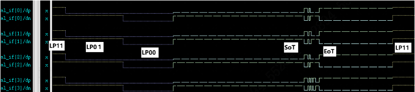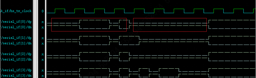 重点关注下图中HS驱动部分,数据lane双边沿输出,时钟和数据lane错半个相位。第1个红框为SoT序列00011101,第2个红框为数据,然后EoT是前最后1bit的反转。