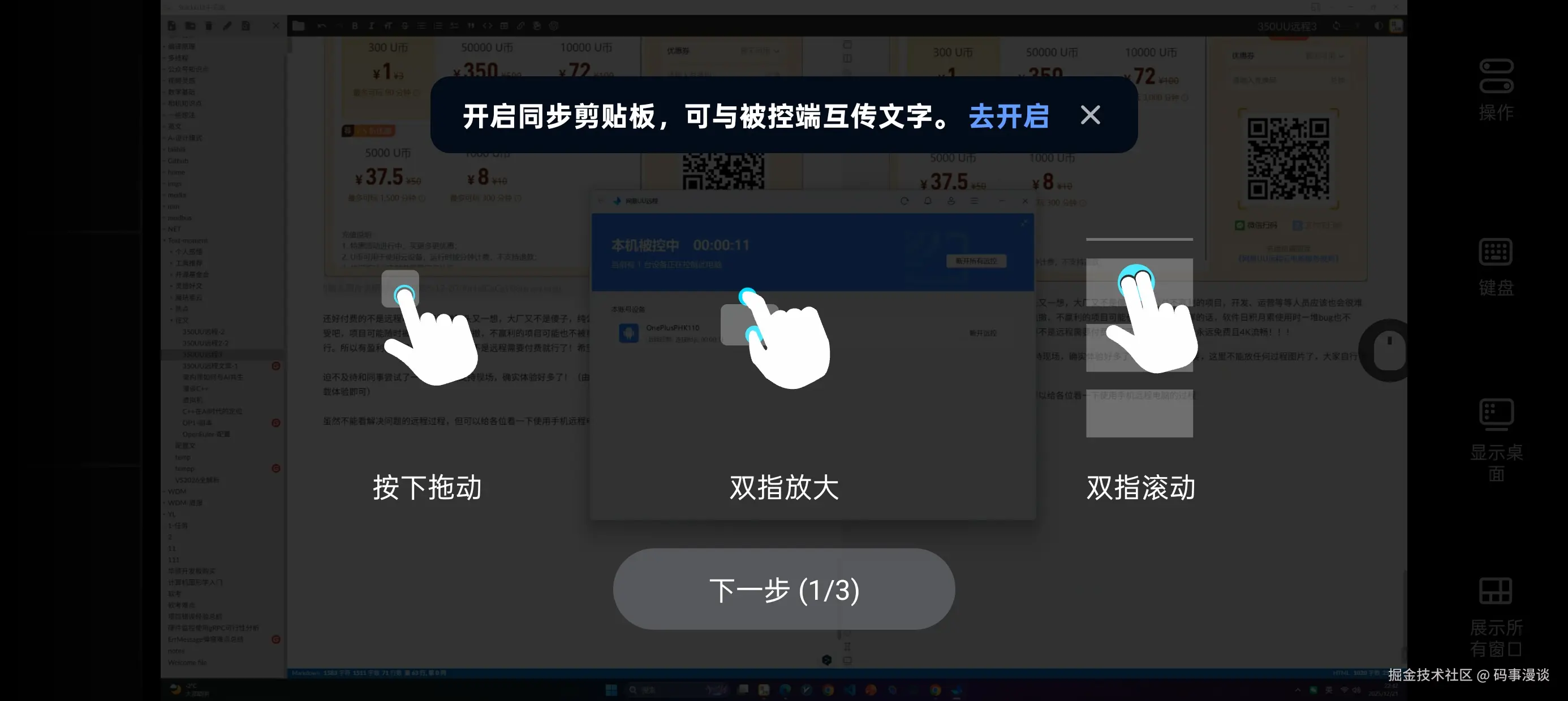 3、对于偶尔临时的手机操作来说,各种手指操作相对来说很便捷!同时它还支持"作弊工具"剪贴板的同步,相信我,这可以大大提升远程支持的速度!