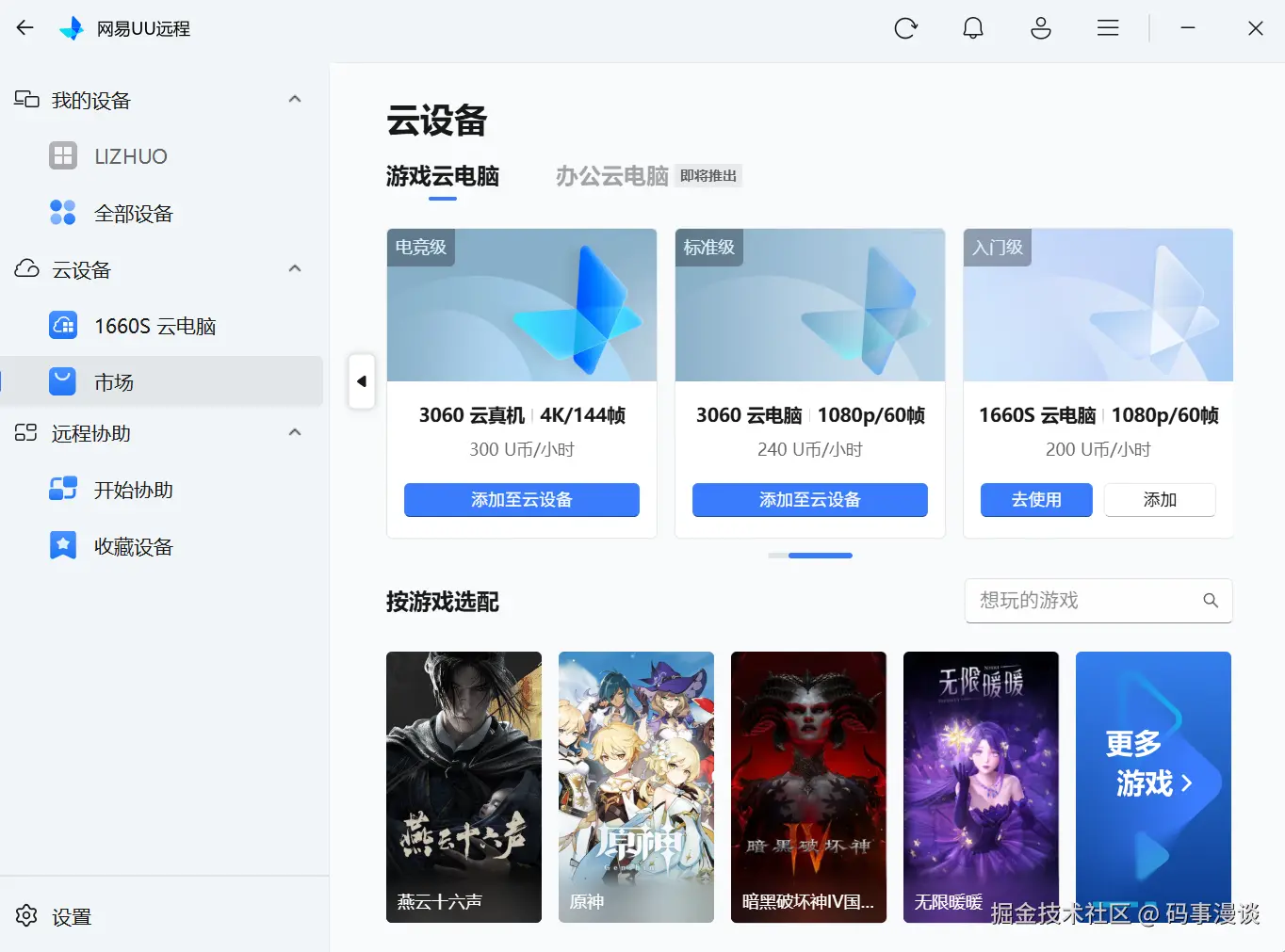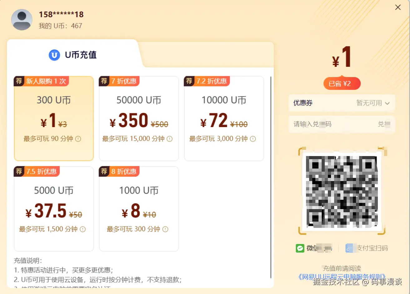 进一步看了下充值界面,不考虑打折的话,就是1块钱=100U币,不打折的情况下,要玩3060需要2.4元一小时,4K+144帧的4070Ti也才4.5一小时,价格还可以。考虑打折的话,那真的很便宜了!