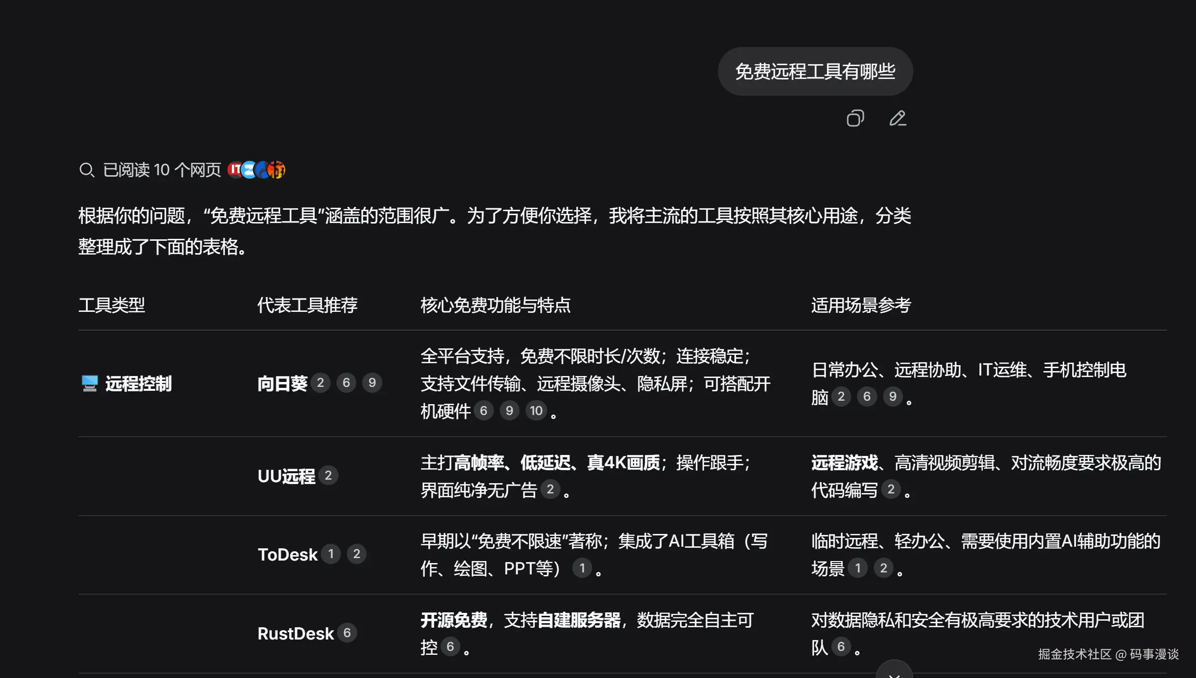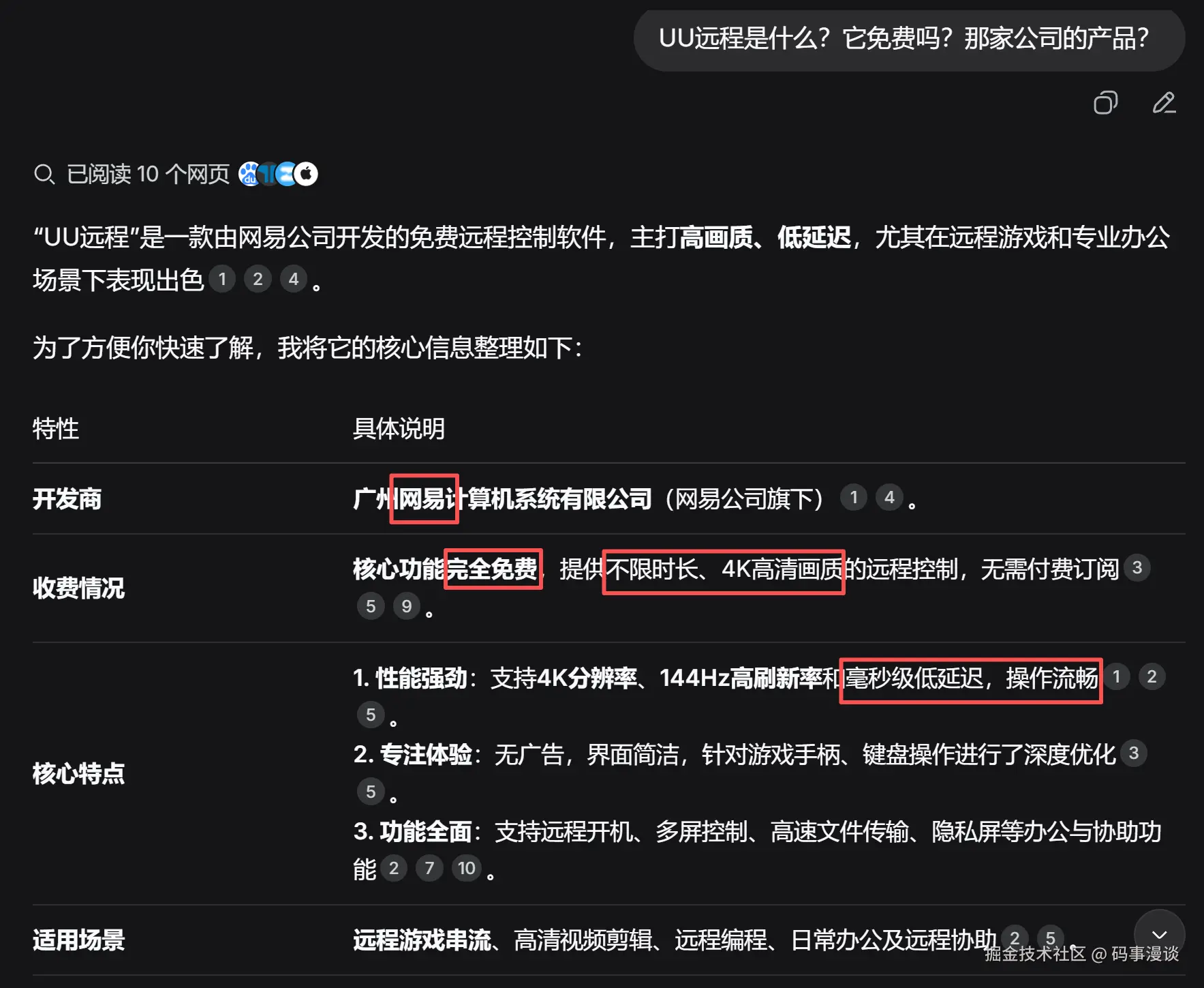 简单检索结合AI推荐,向日葵大家懂,ToDesk曾经免费,RustDesk有门槛,一个之前没听过的远程工具进入我的视线:UU远程,进一步追问AI,发现是大厂网易家的
