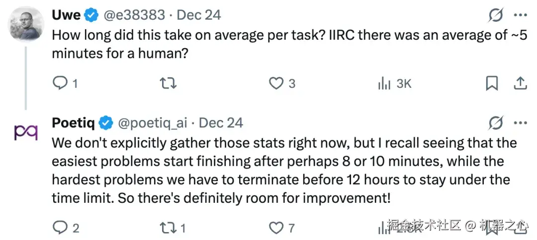 Poetiq 回复称,「我们现在没有专门收集这些统计数据,最简单的问题大概在 8 到 10 分钟后就能完成,而最难的问题必须在 12 小时之前终止,以保持在时间限制内。所以,未来肯定还有改进的空间。」