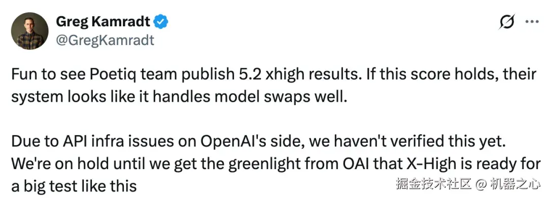 ARC Prize 总裁 Greg Kamradt 表示,「很高兴看到 Poetiq 发布 GPT-5.2 X-High 的结果。如果这个成绩能保持下去,他们的系统看起来能很好地处理模型交换。不过,在 OpenAI API 的基础设施问题解决之前,结果还没有得到完全验证。」