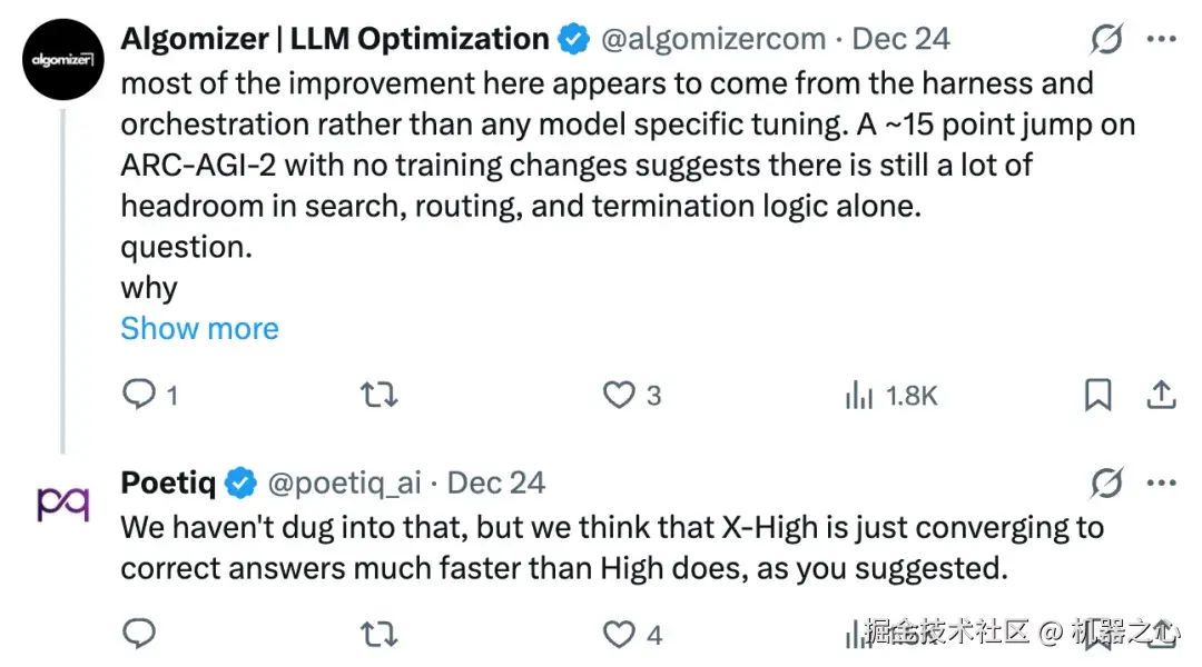 还有人指出「大部分改进似乎来自于测试框架和协调机制,而不是任何模型特定的调优。没有训练变更的情况下,ARC-AGI-2 上提高了大约 15%,这表明仅在搜索、路由和终止逻辑方面就还有很大的提升空间」。