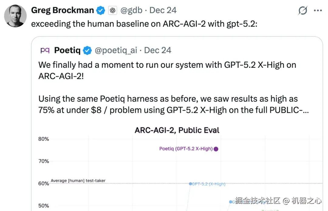 OpenAI 总裁 Greg Brockman 也转推表示:GPT-5.2 在 ARC-AGI-2 上超越人类基准成绩。
