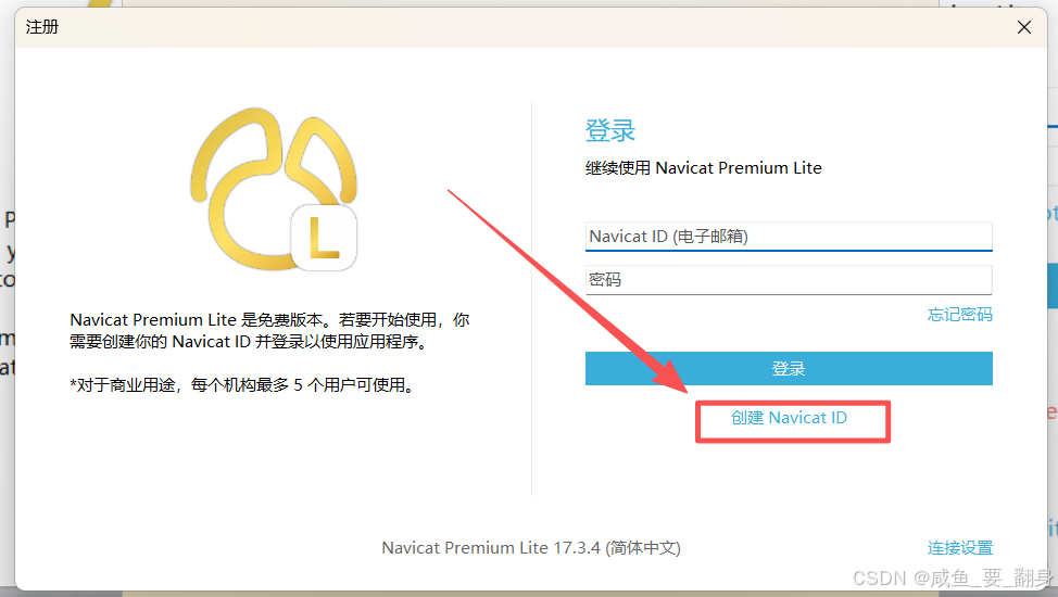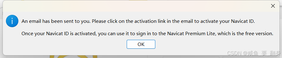 翻译:一封电子邮件已发送给您。请单击电子邮件中的激活链接以激活您的Navicat ID。激活Navicat ID后,您可以使用它登录免费版本的Navicat Premium Lite。