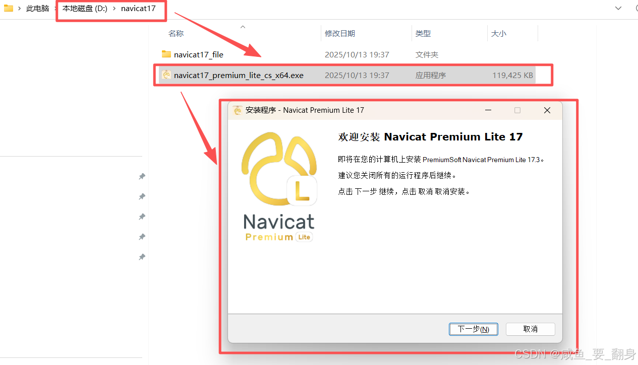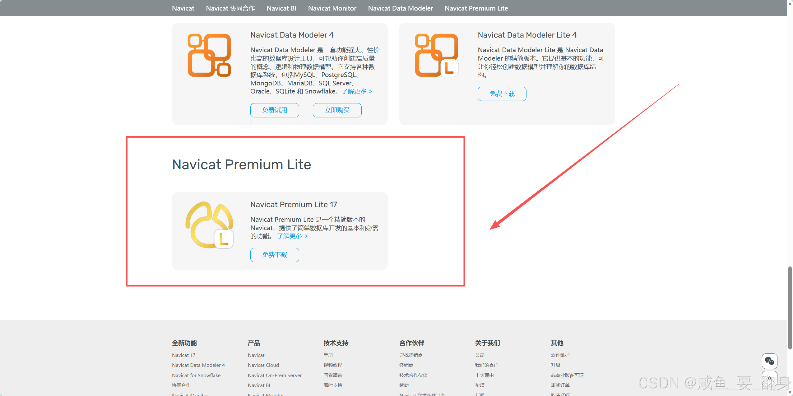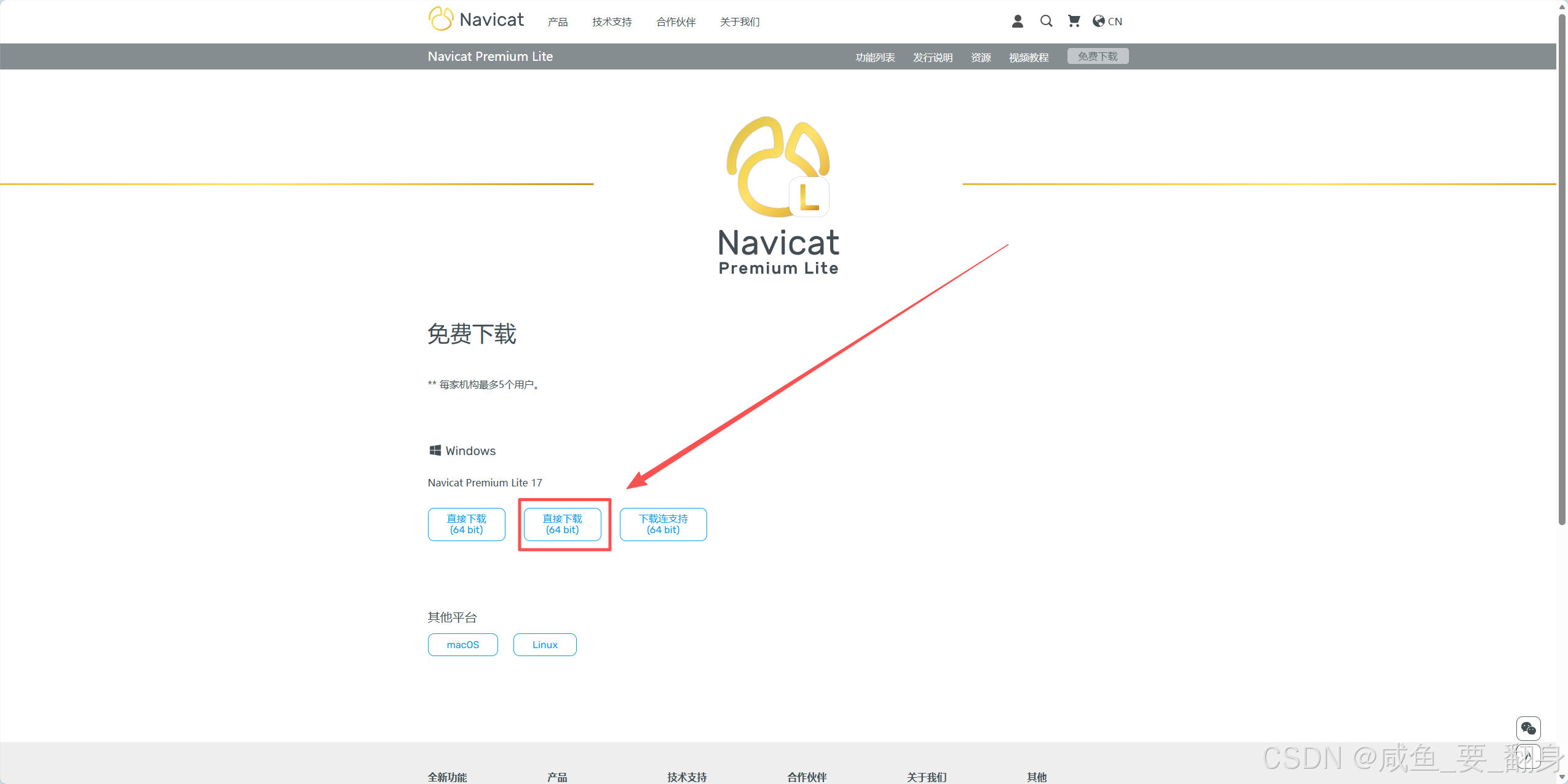 我们点击"免费下载"跳到下面的页面,选择第二个,第二个为中文,navicat170_premium_lite_cs_x64 是一个文件名,通常对应 Navicat 数据库管理工具的一个特定版本。如下: