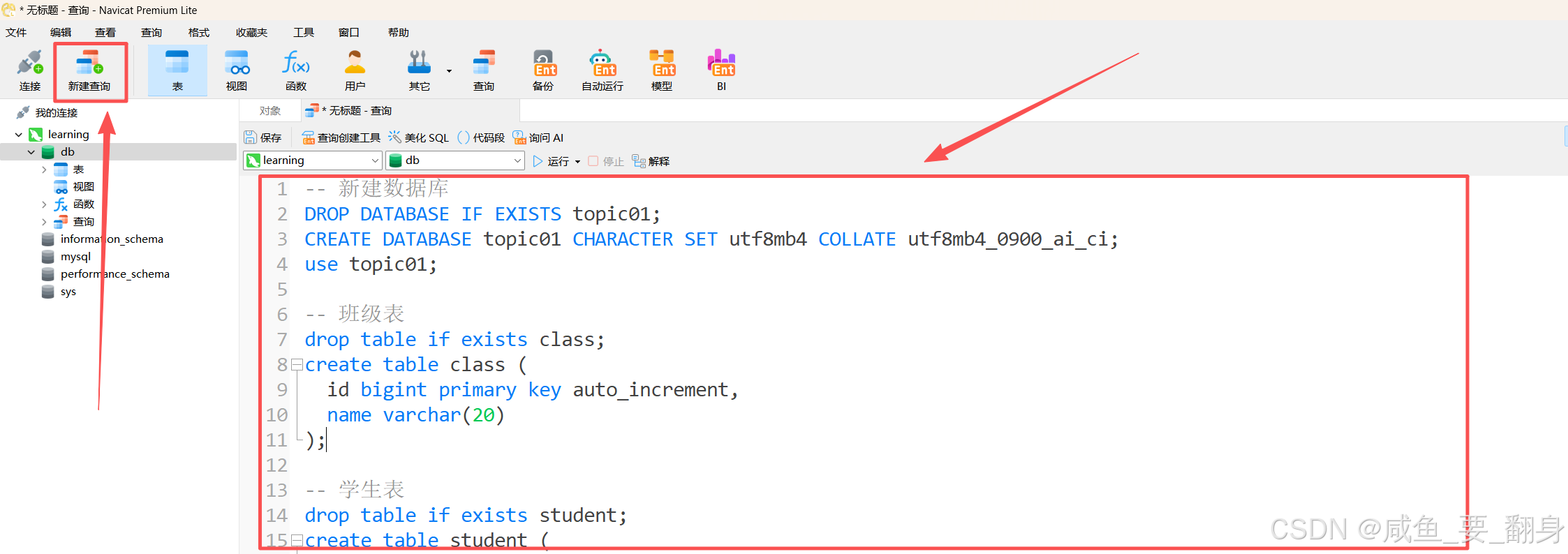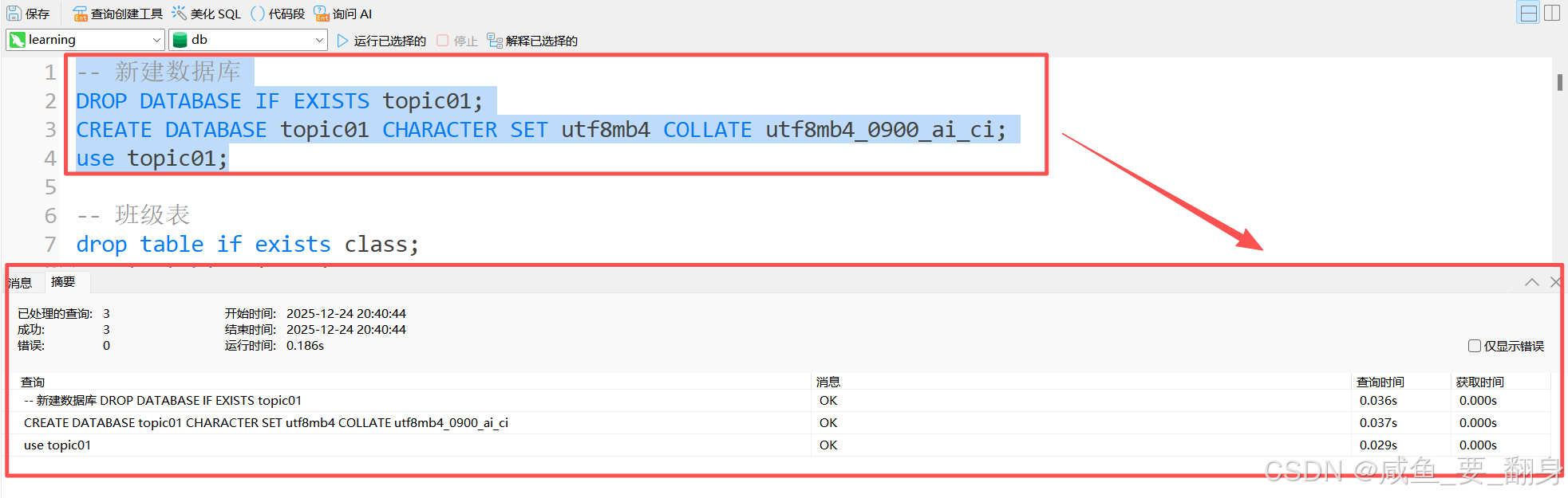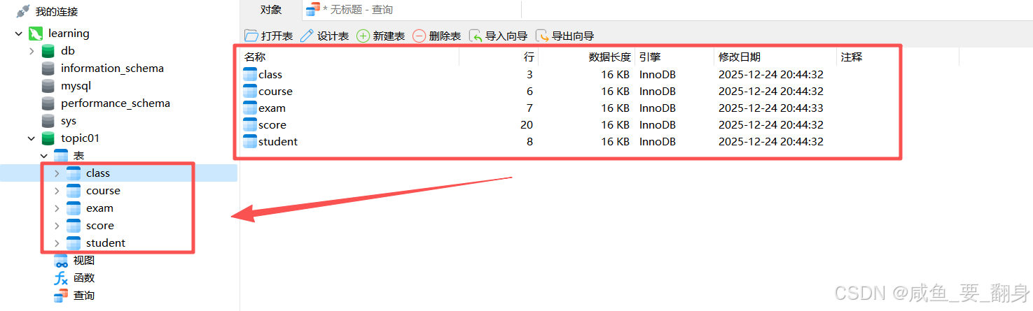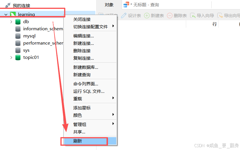 此处经过上面的全部SQL语句执行完后,我们可以右击当前的连接,往下找到"刷新"这个按键,刷新一下,因为此时topic01这个数据库的图标可能还没有显示出来,所以需要刷新一下(反正遇事不决就右键对应的地方看看有没有解决方法):