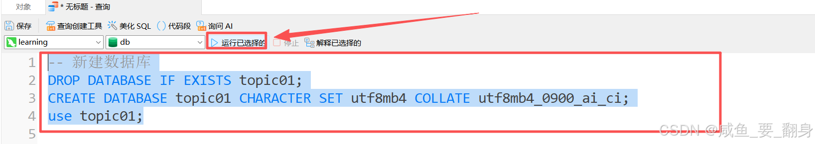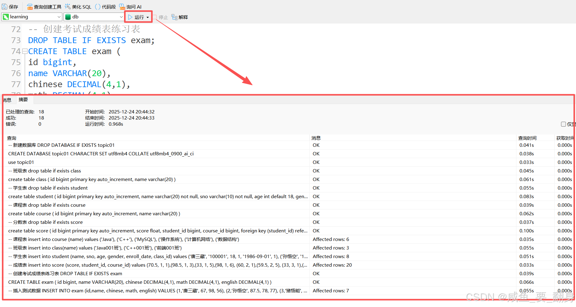可见如果选中部分我们想要选择的SQL语句的话就是执行该部分,而不是全部执行;相反如果不选的话,只是点击"运行"这个按钮,则会全部执行,如下: