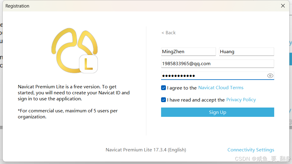 不用管我下面的界面是英文的,因为我在安装的时候傻乎乎地安装了英文版的(也就是第一个),后来才发现,现在改回来中文版的了,将就着看吧,都一样的;此时我们要注册Navicat的账号,需要使用到邮箱来注册: