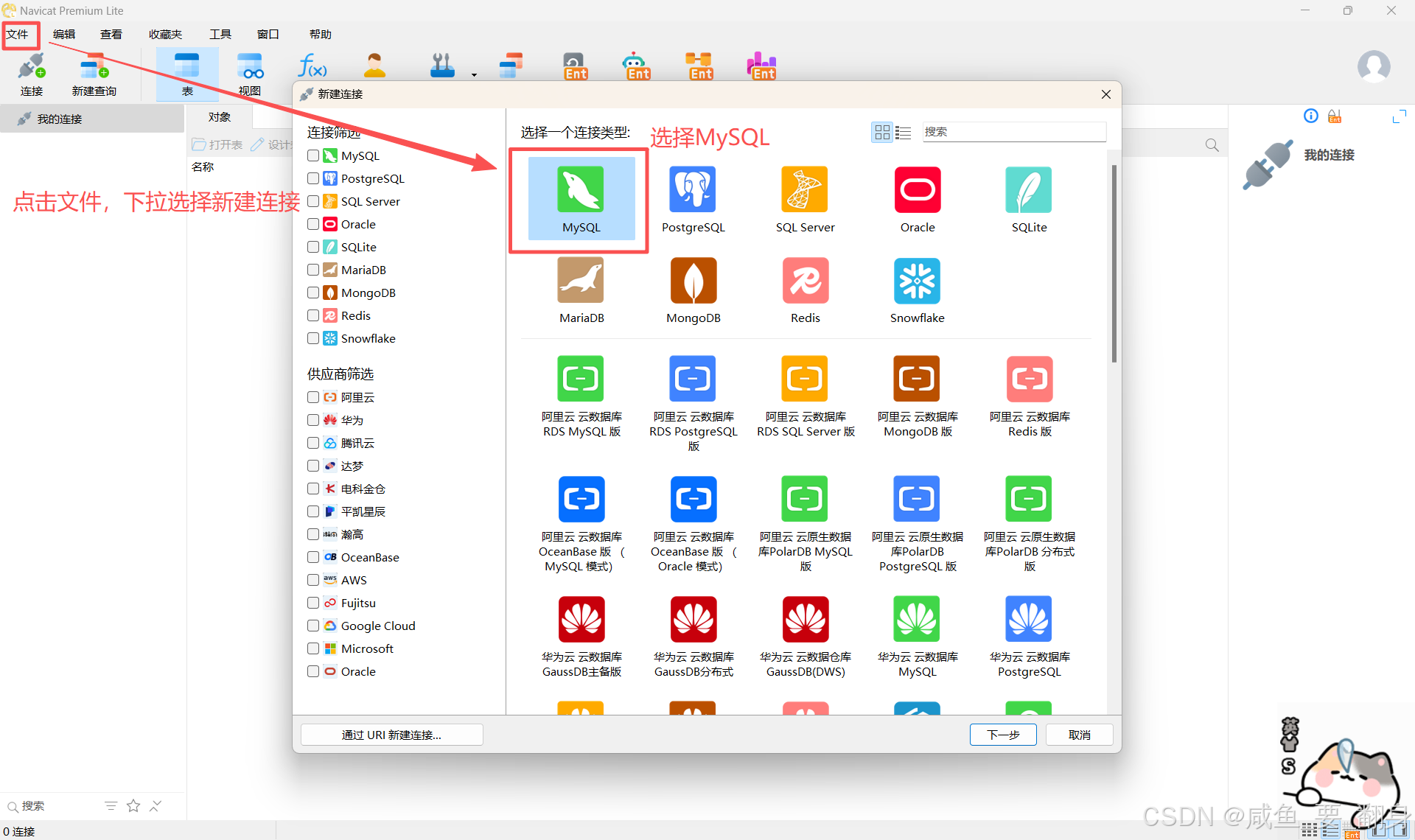 此时我们点击左上角的"文件"按钮,下拉选择新建连接,或者直接点击"连接"按键,点击下一步或者直接双击MySQL: