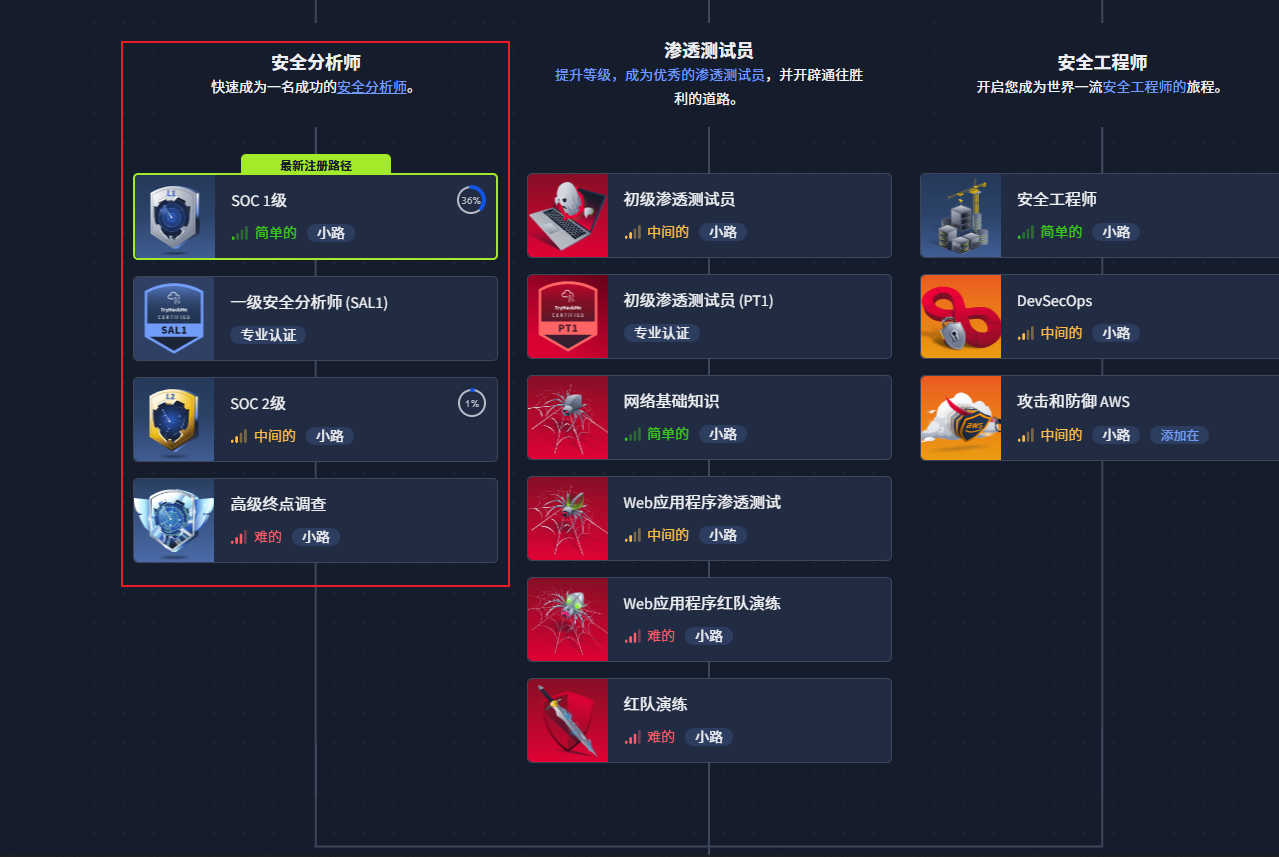 - 掌握并练习核心安全运营中心(SOC)技能。具备红队演练或通用IT技能等相关技能也会有所帮助!: https://tryhackme.com/path/outline/soclevel1