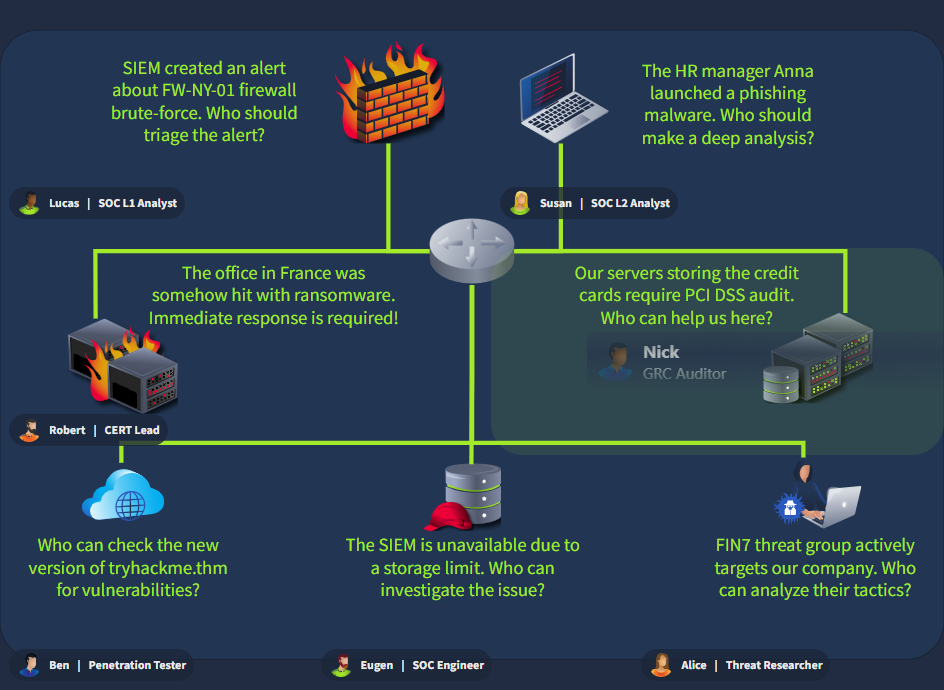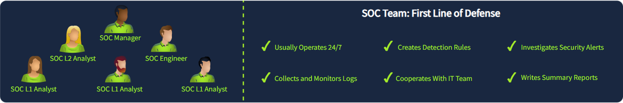 这里很可能就是您网络安全之旅的起点!安全运营中心(SOC)是组织网络安全的核心枢纽------他们是第一道防线,负责处理各种警报并应对大多数攻击。您可以在此了解更多关于:https://tryhackme.com/room/socfundamentals SOC结构的信息,但一个高效的SOC通常由以下角色组成:
