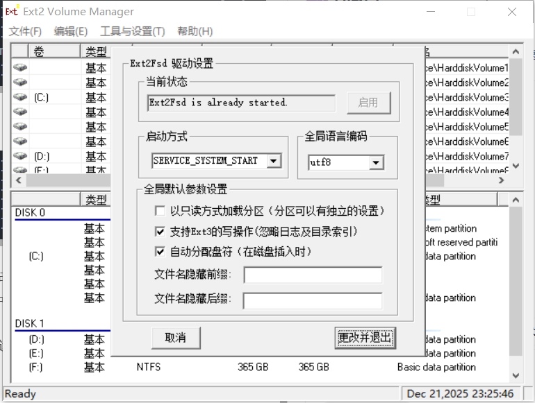 免费开源,Windows支持ext4,下载安装后,使用管理员权限运行这个软件,配置文件系统驱动,选择