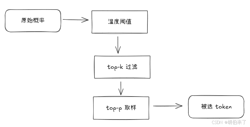 当模型需要选择下一个 token 时,它从词汇表中每个单词的原始概率(称为 logits)开始。但我们如何将这些概率转化为实际的选择呢?让我们来分析一下这个过程: