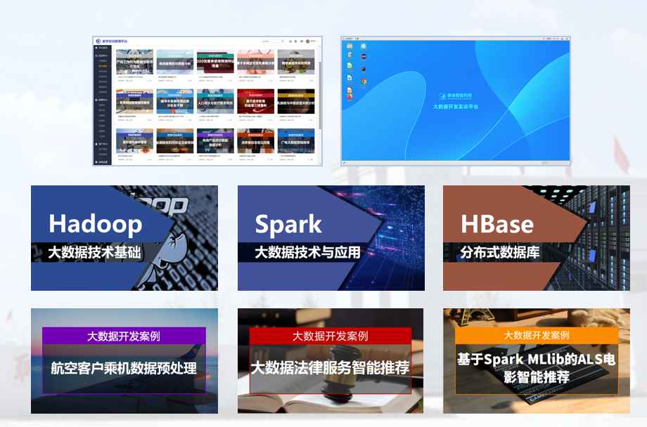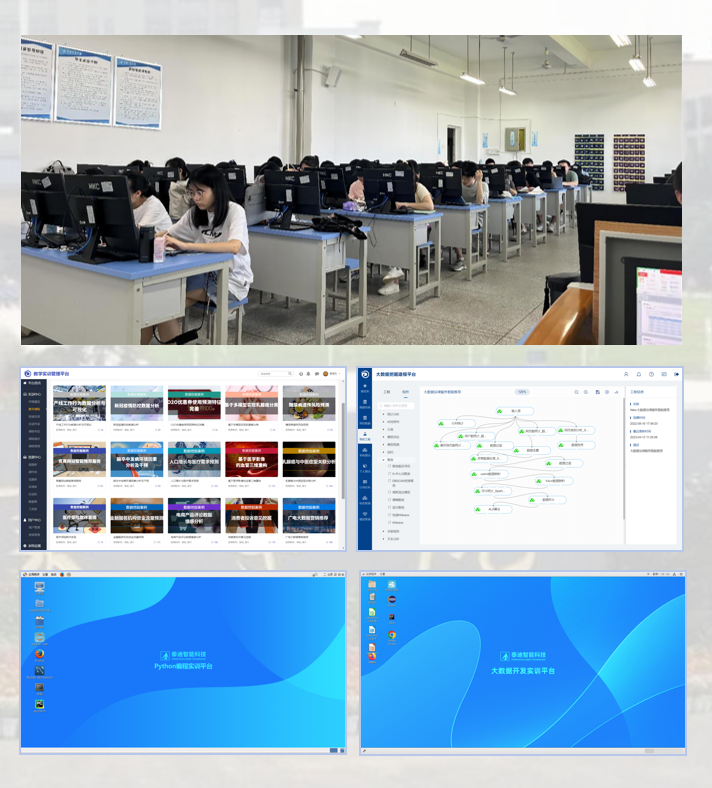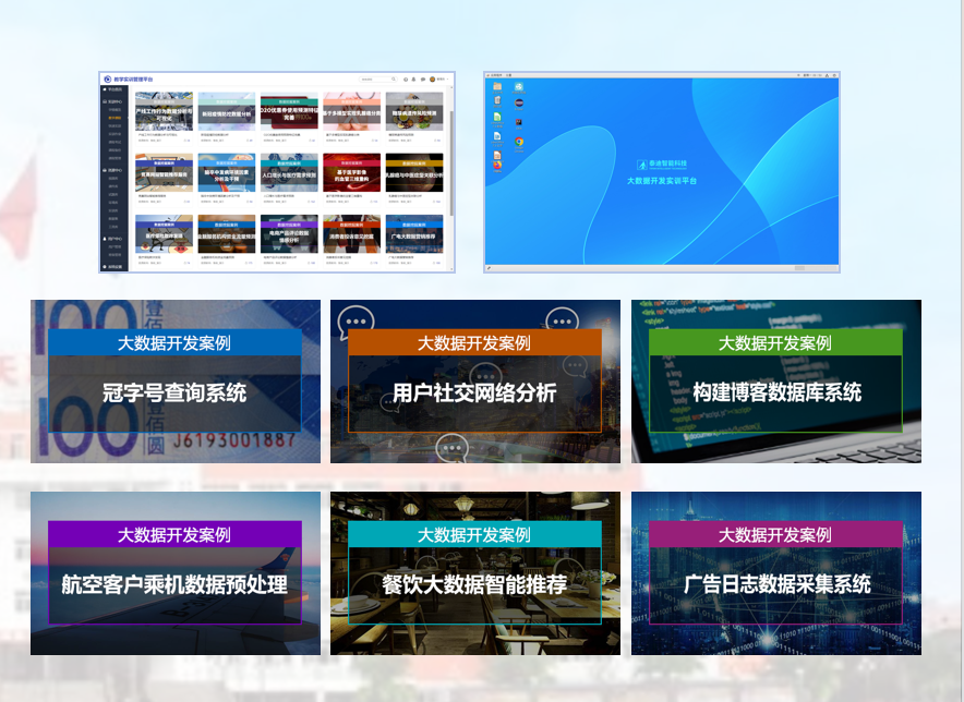 主要内容:云计算资源管理平台;大数据教学管理平台;Python编程实训平台;大数据开发实训平台;大数据挖掘建模平台