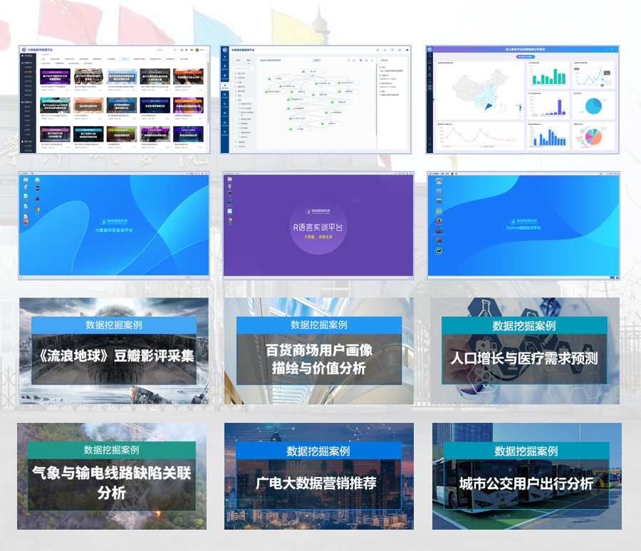 主要内容:大数据教学管理平台;Python编程实训平台;大数据挖掘建模平台;大数据开发实训平台;R语言编程实训平台;大数据可视化平台;大数据方向课程案例20余门